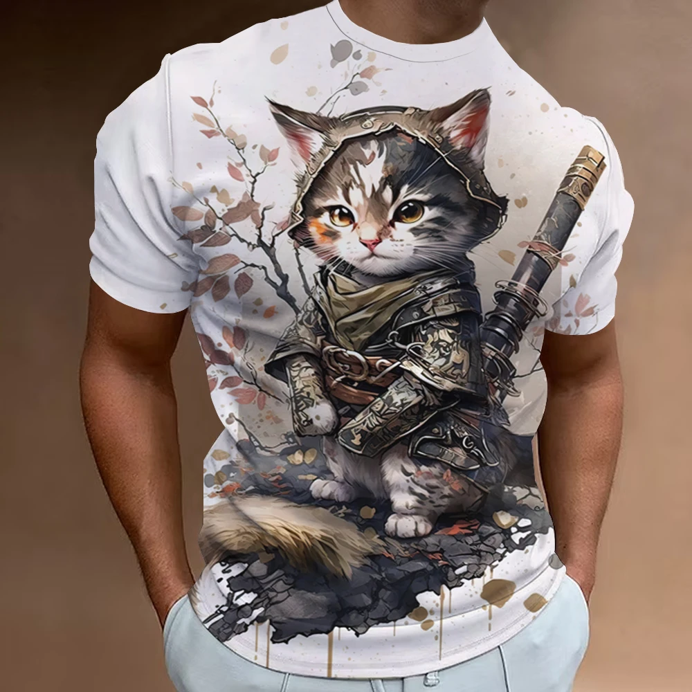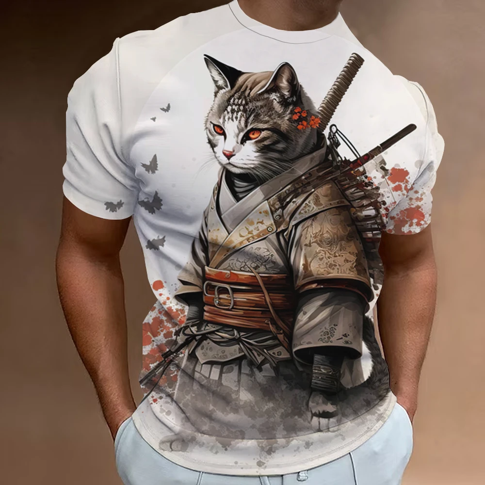 3d Samurai Cat Print Short Sleeve T-Shirt For Men New Retro Men’s T-Shirt Fashion Oversized Man Clothes Quick Dry Tees Tops 2024