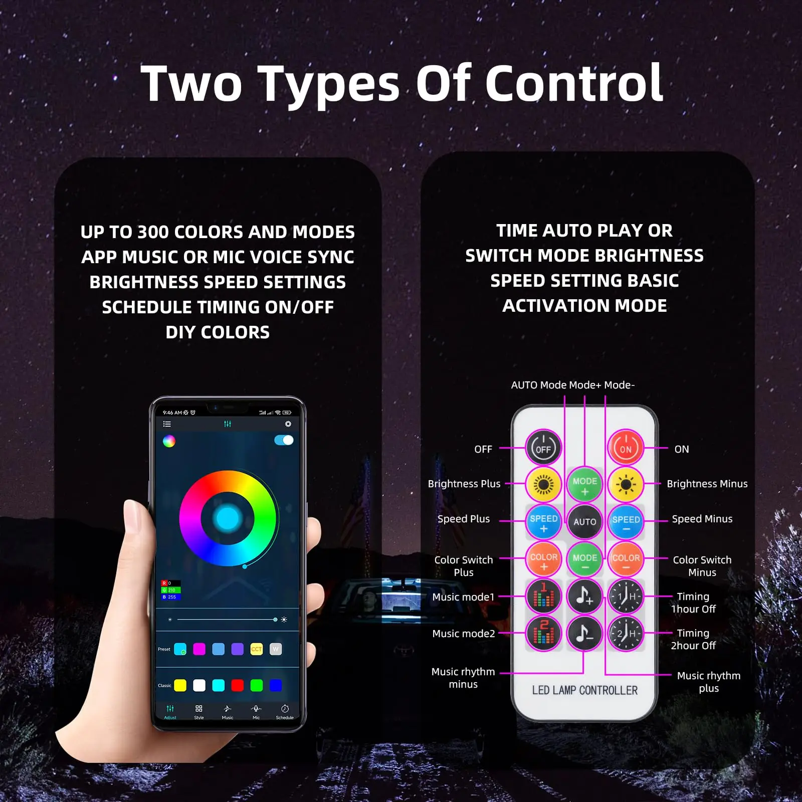 LED Lifespan: 50000 hours 300 modes to choose from, Adjustable Speed and Brightness.