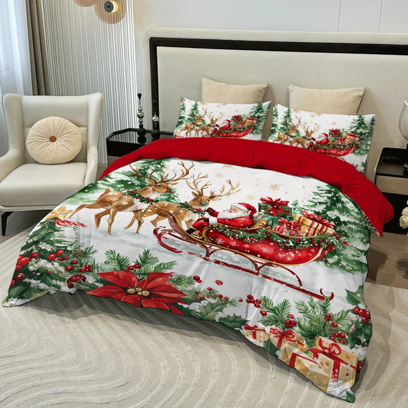 3PC Sled Elderly Duvet Cover Cute Elk Set Bedding Set (1Duvet Cover&2Pillowcases) Christmas Furniture Decor No Filler/Core