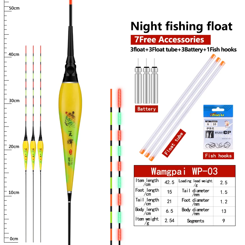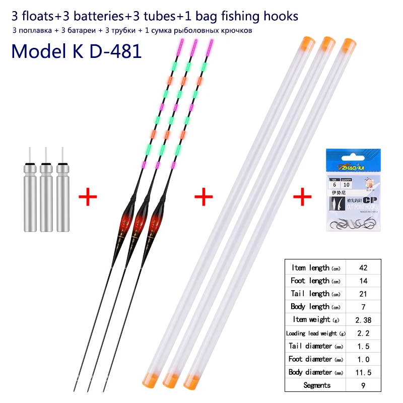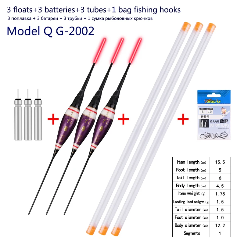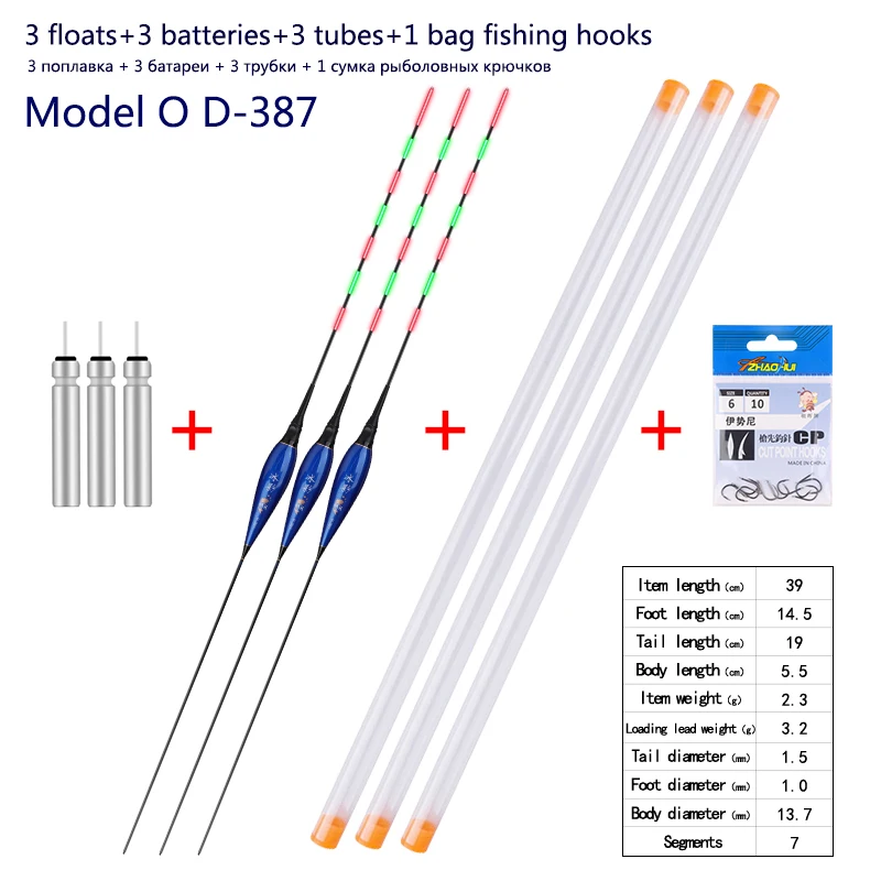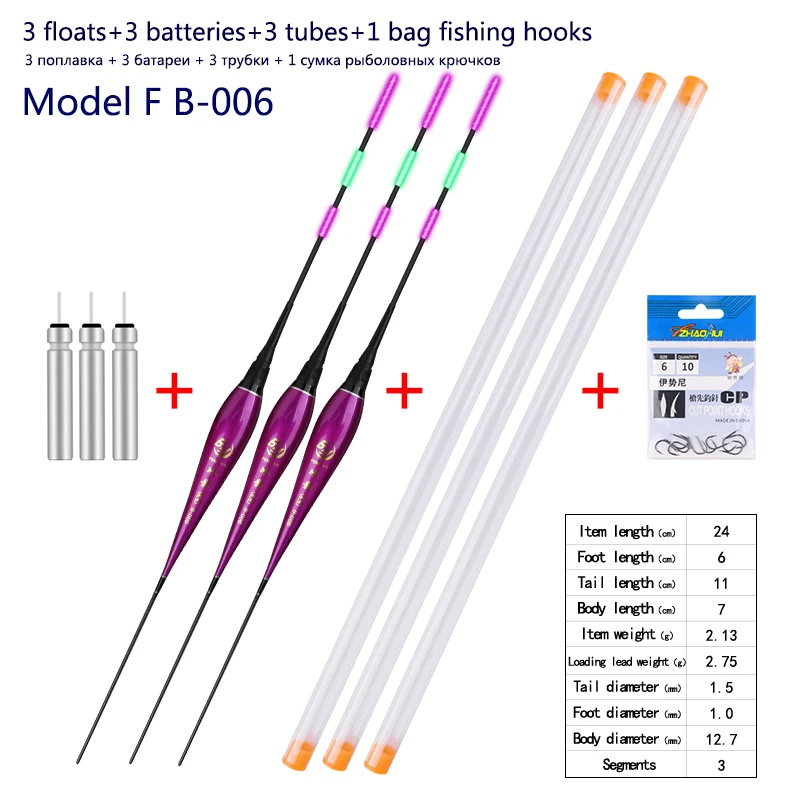 3 piece fishing floats+3 pieces batteries+3 pieces float tubes+1 bag fishing hooks