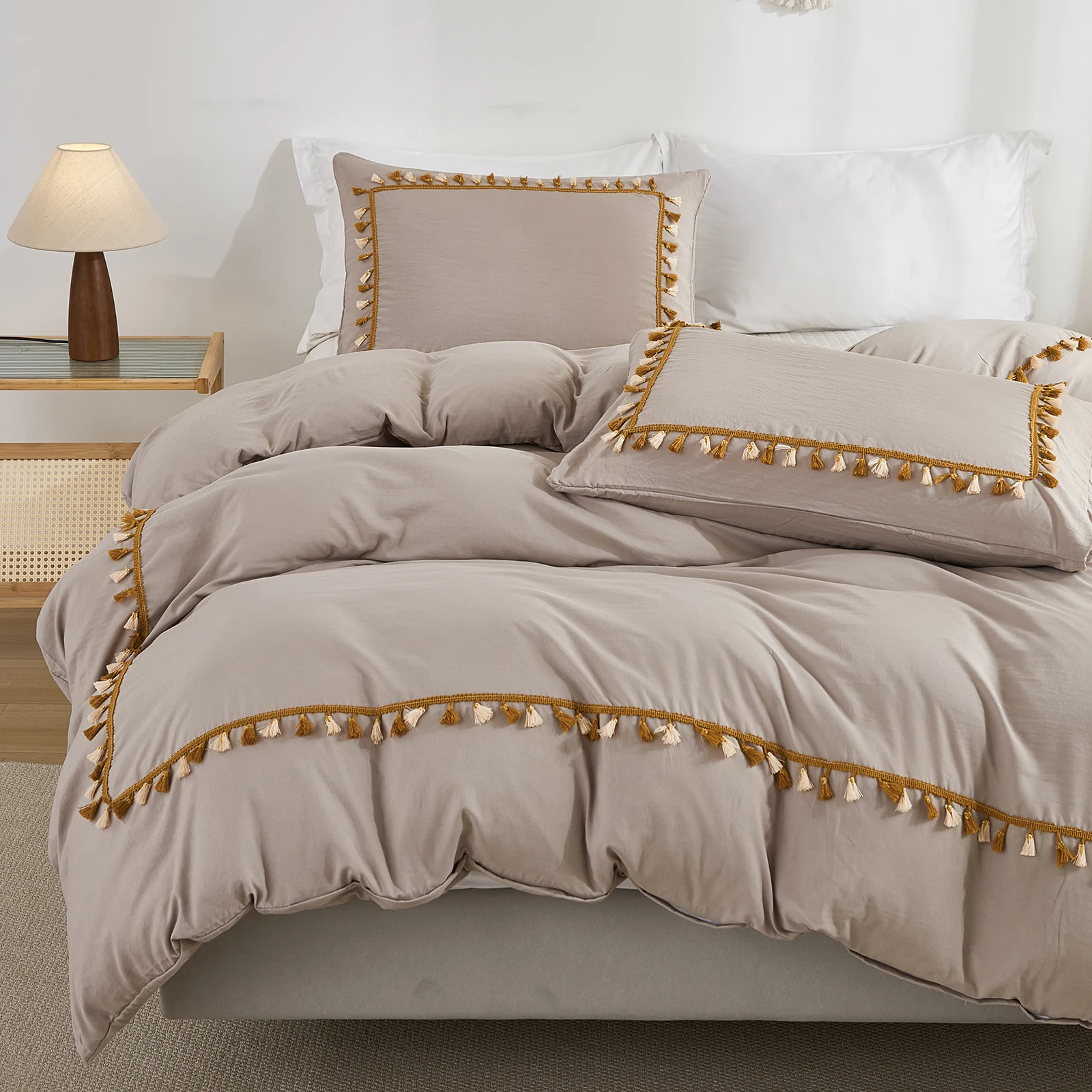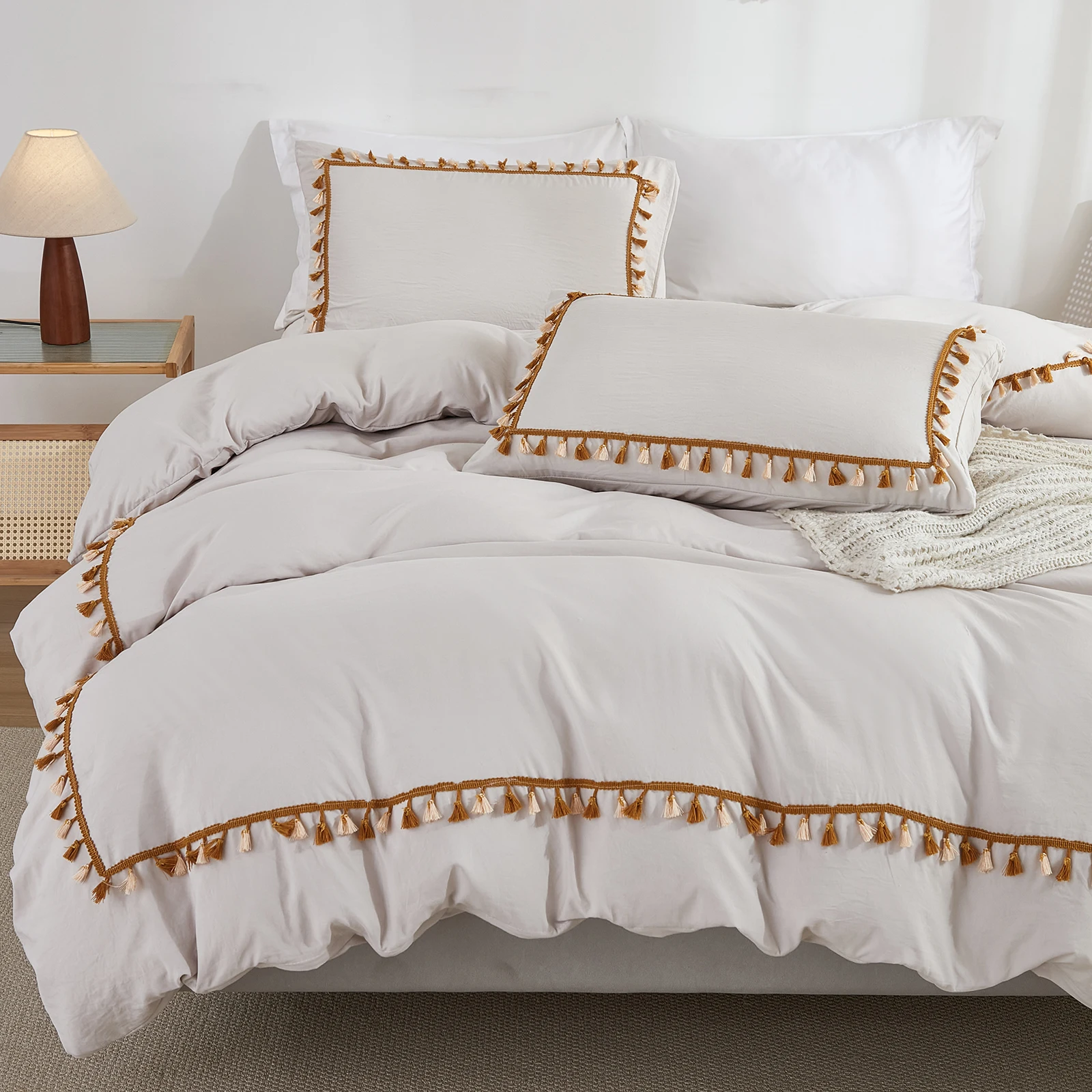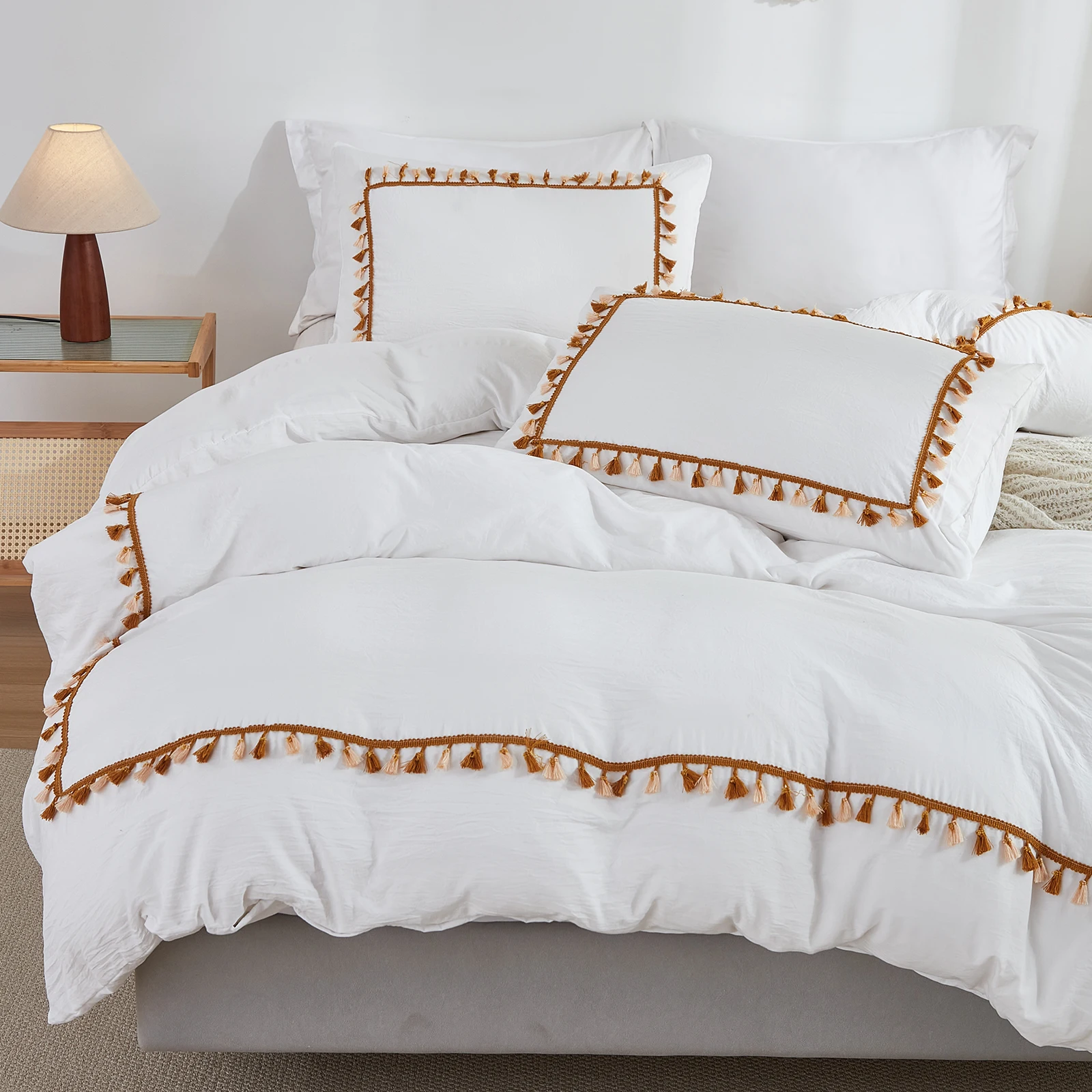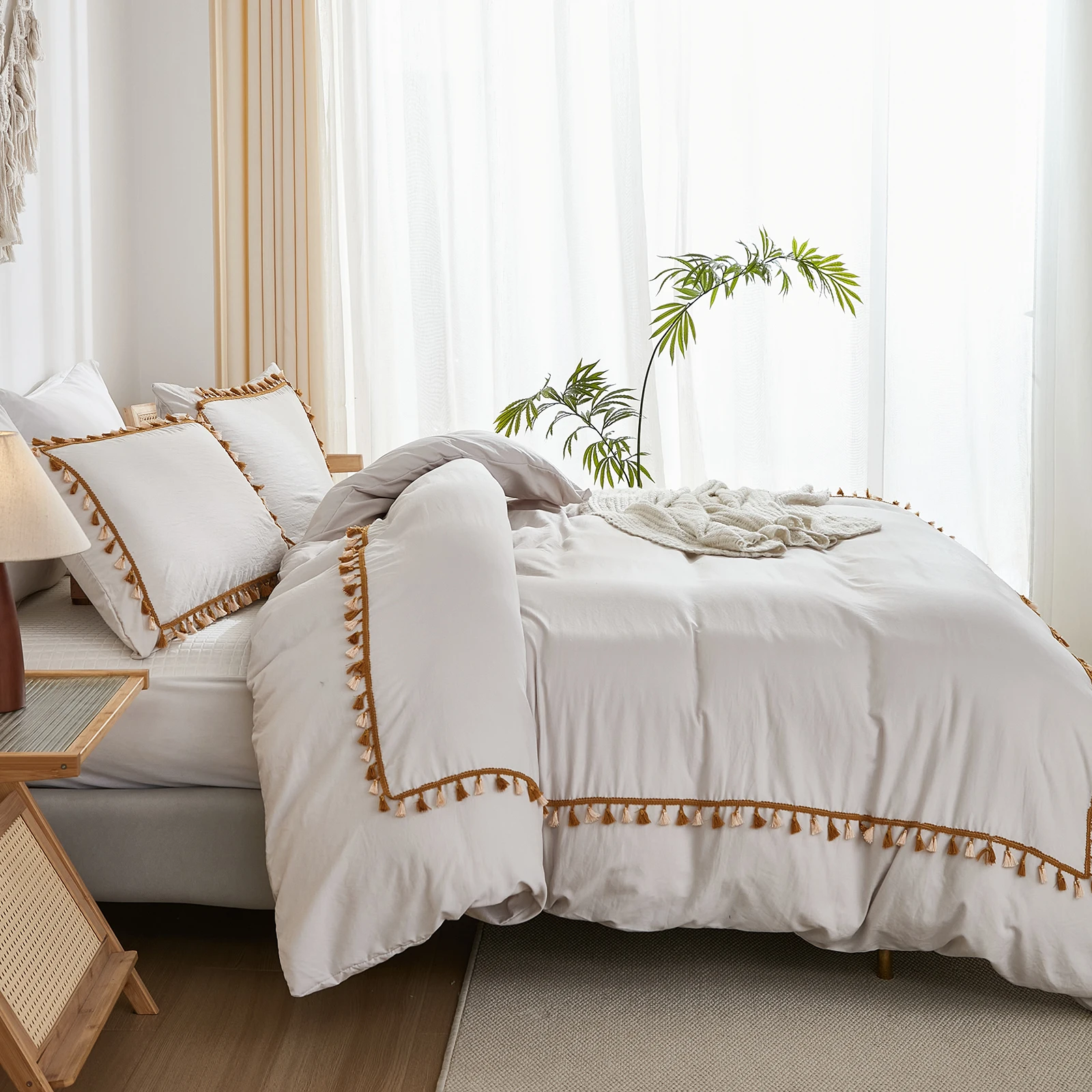 3PCS White And Khaki Duvet Cover Set Tassel Comforter Cover Tassel Country Bed set soft lightweight Down Bedding Set for