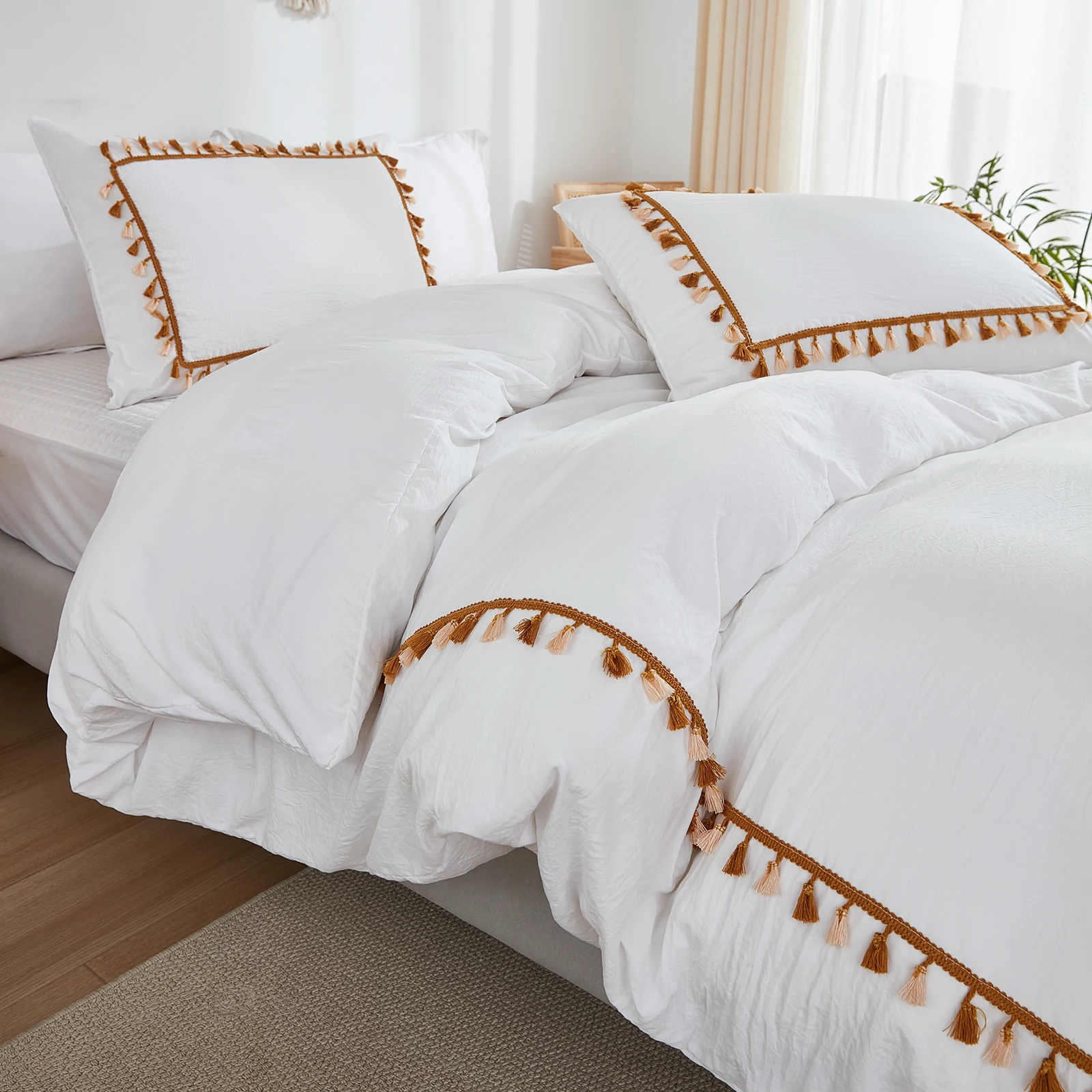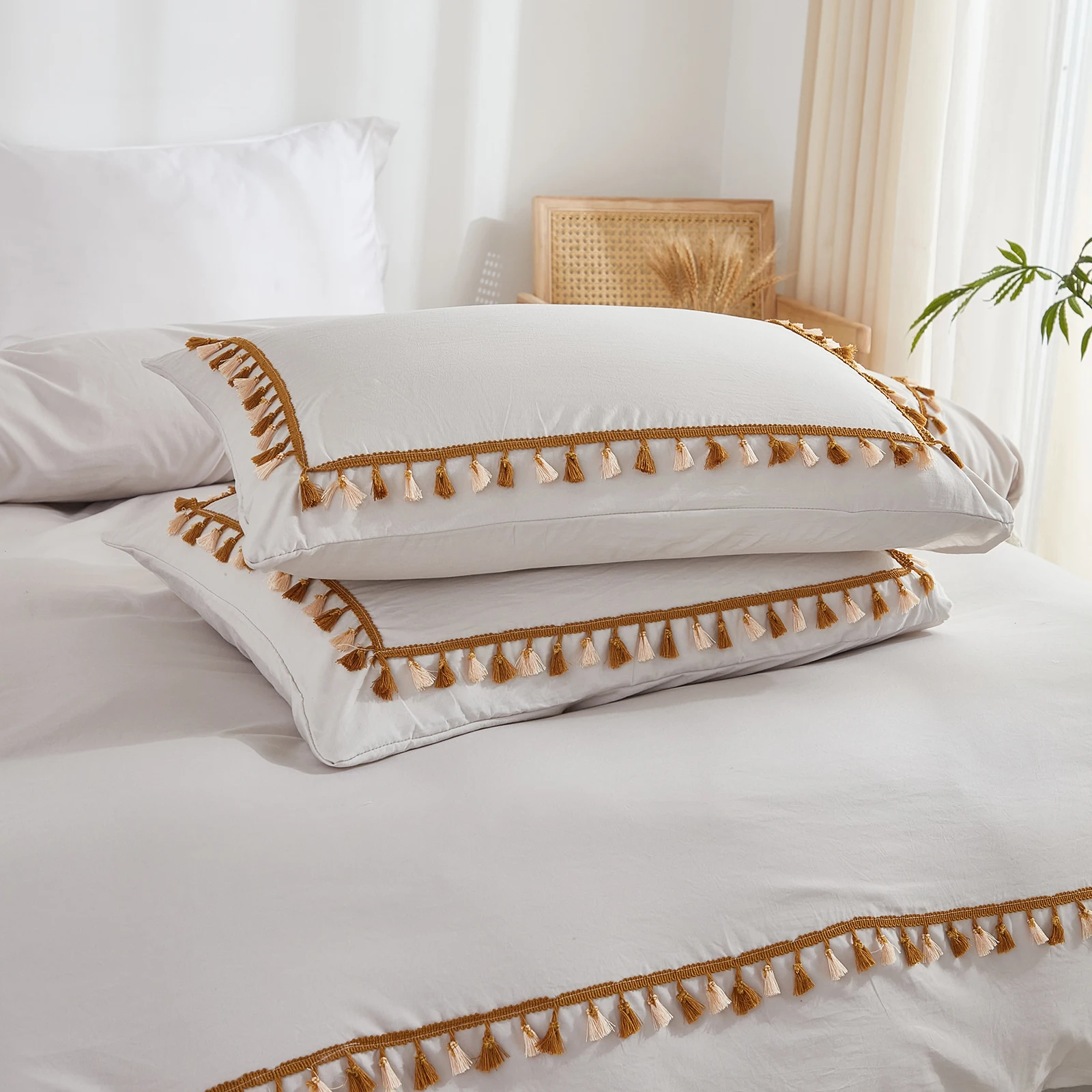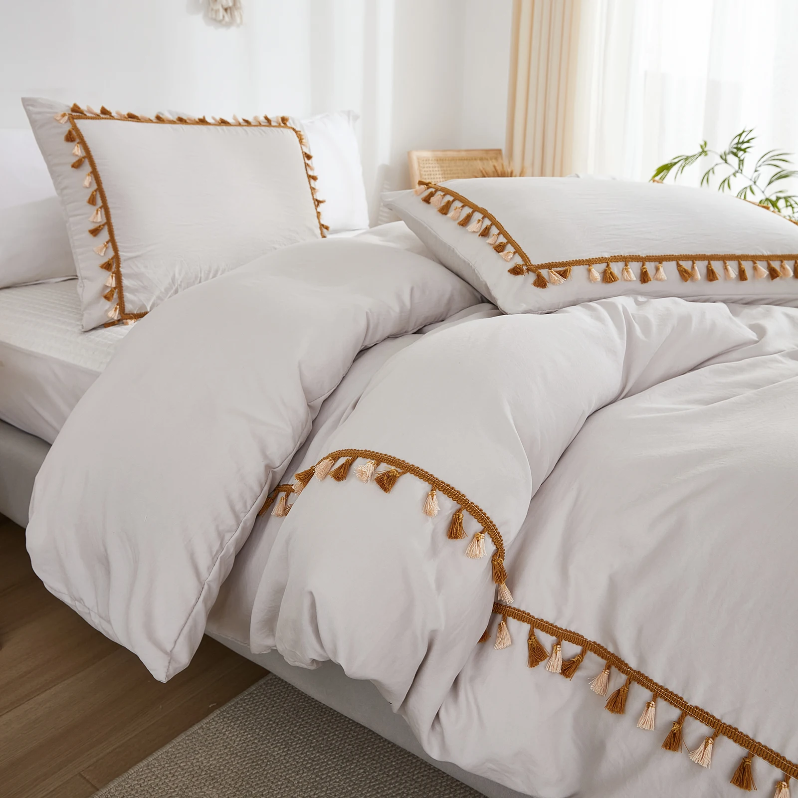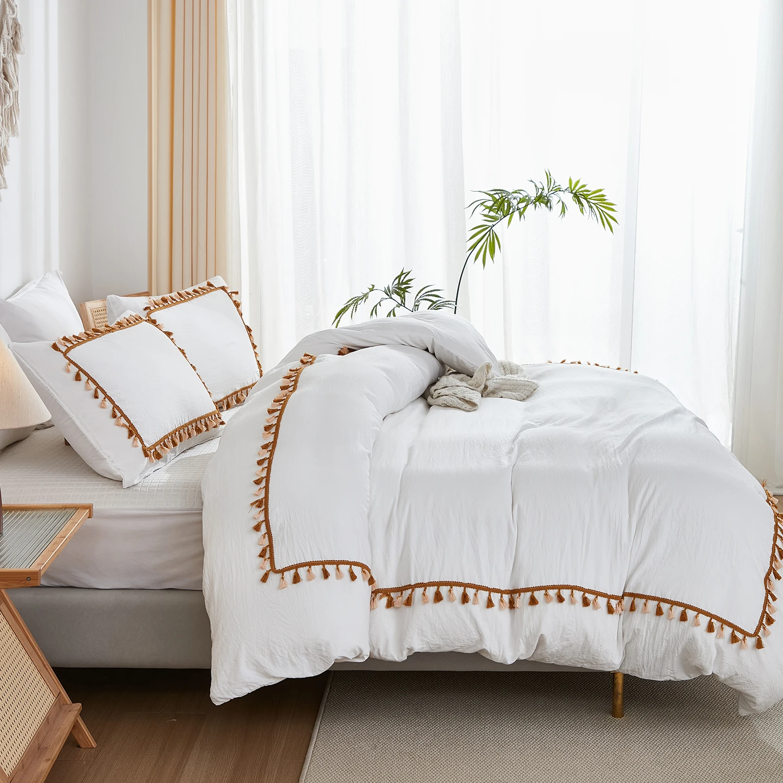 3PCS White And Khaki Duvet Cover Set Tassel Comforter Cover Tassel Country Bed set soft lightweight Down Bedding Set for