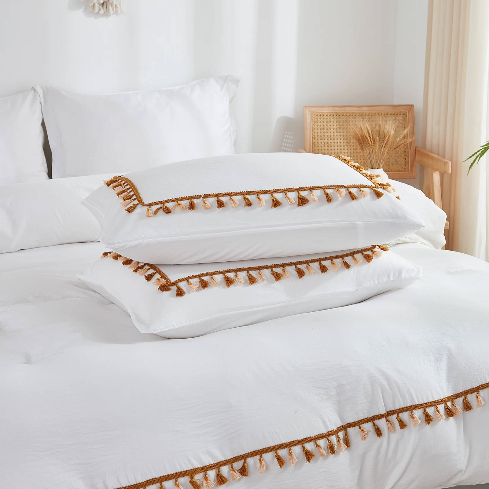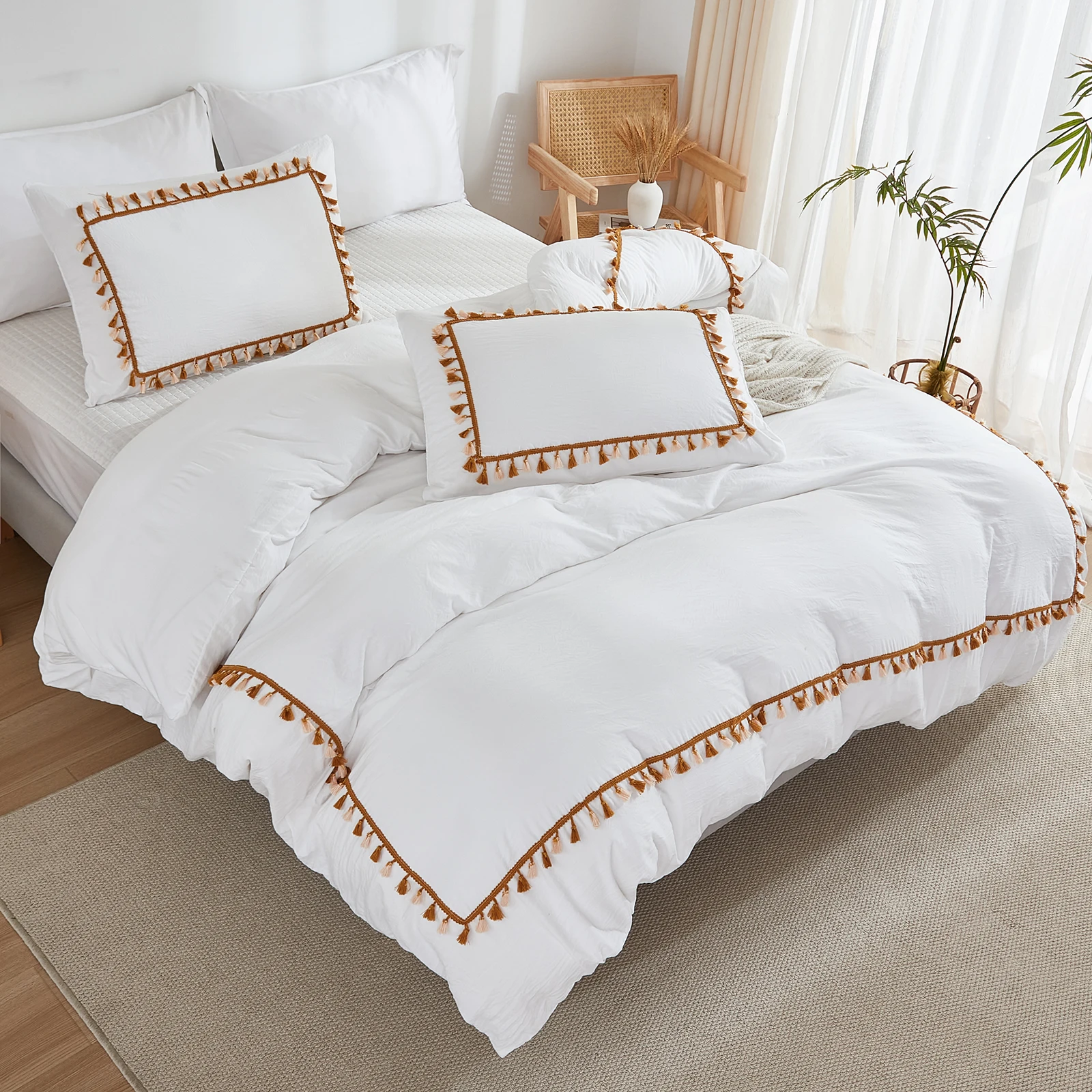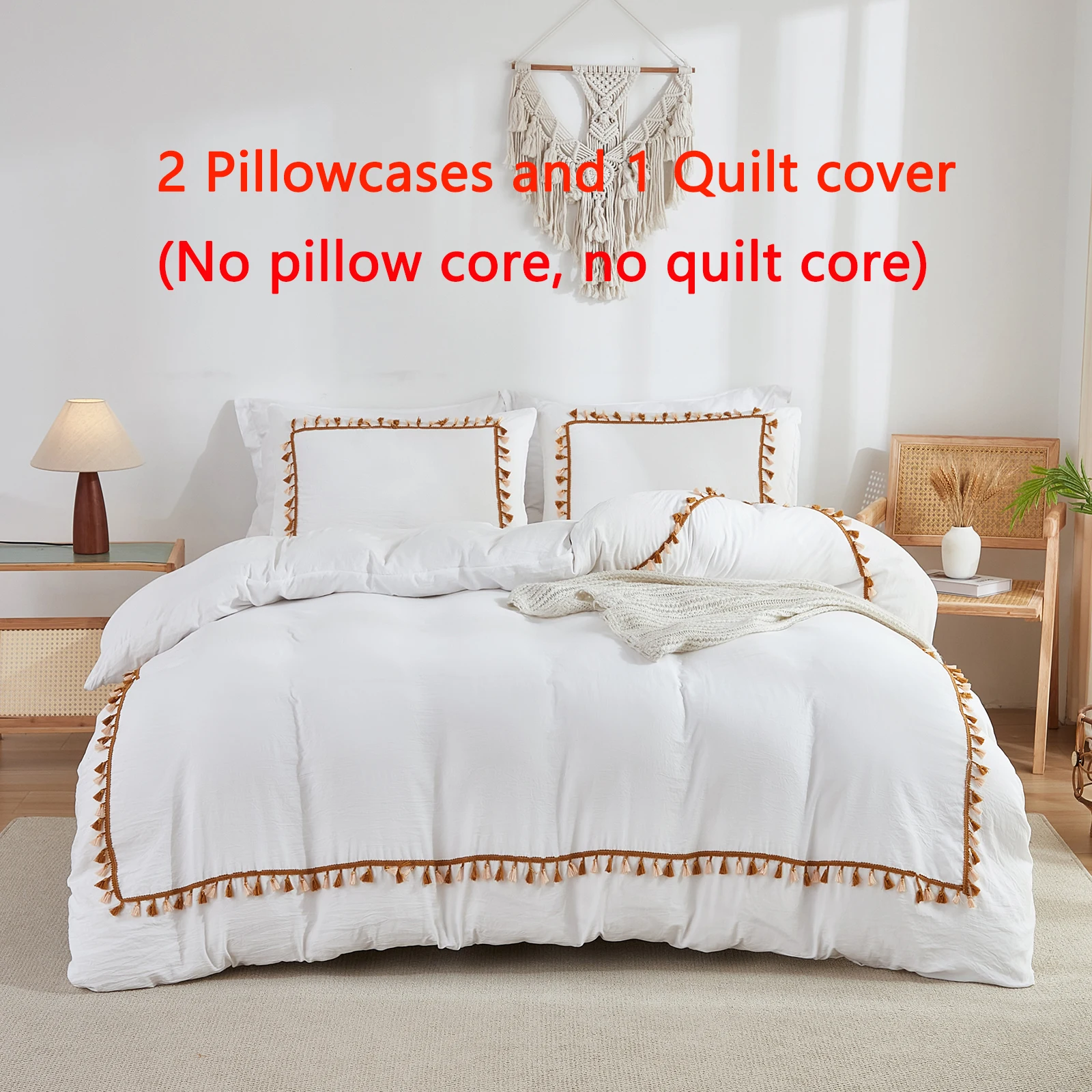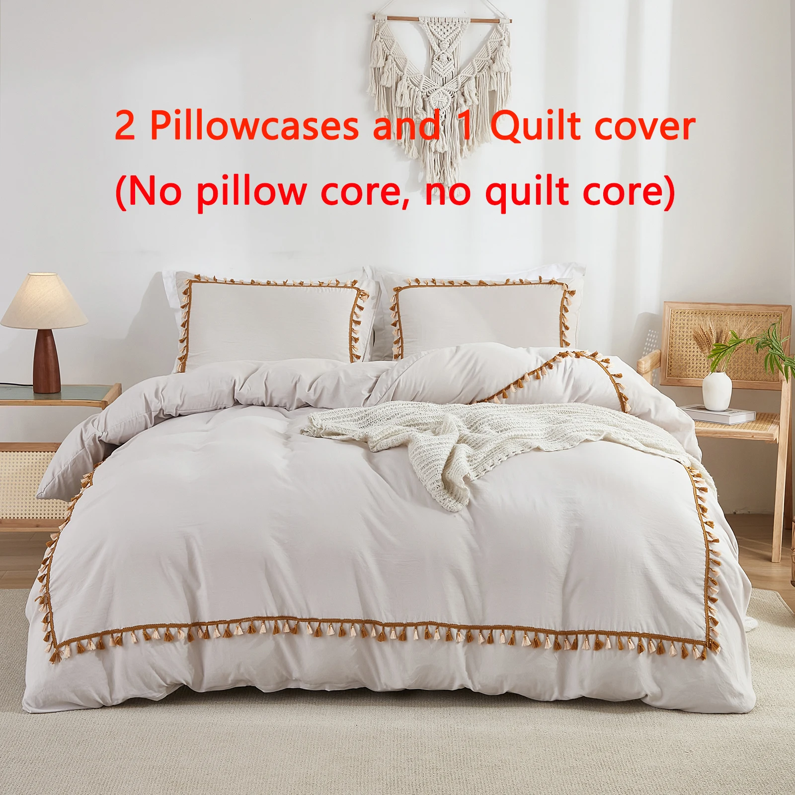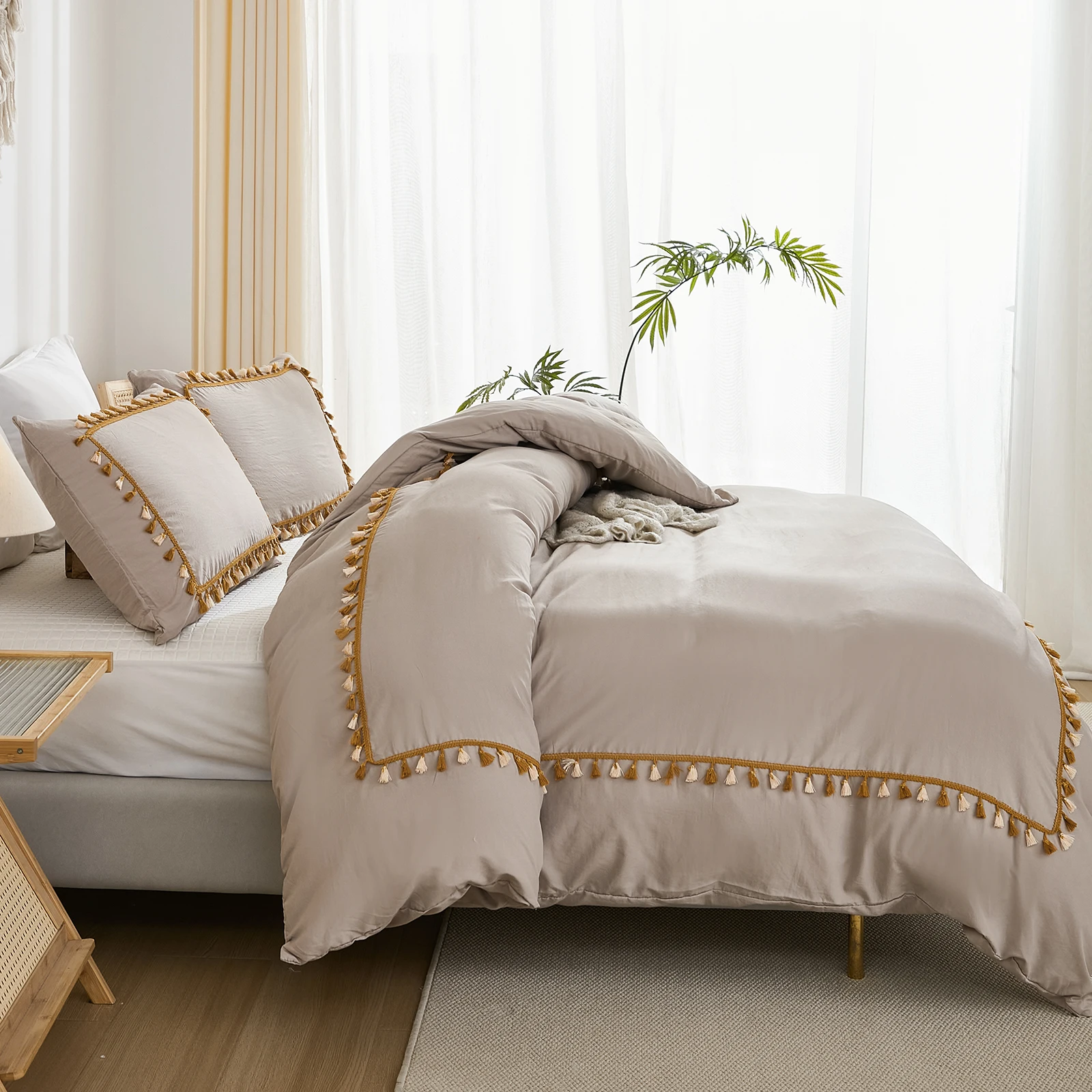 3PCS White And Khaki Duvet Cover Set Tassel Comforter Cover Tassel Country Bed set soft lightweight Down Bedding Set for