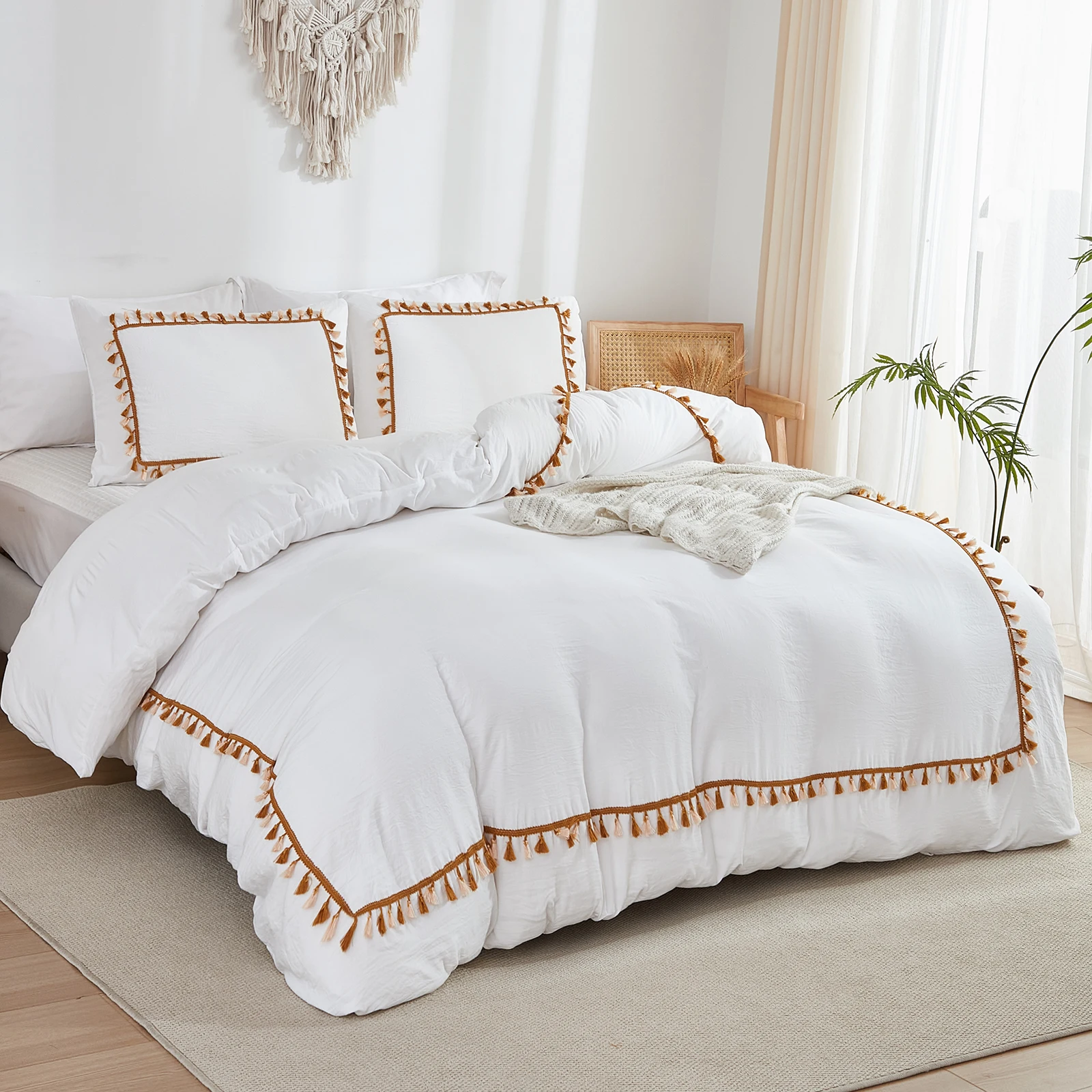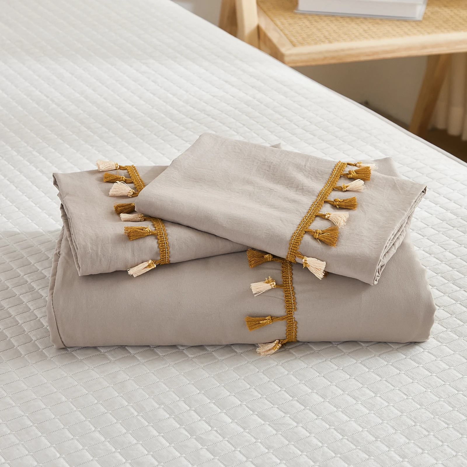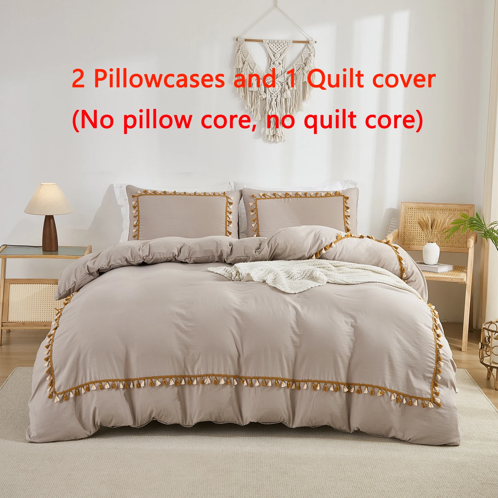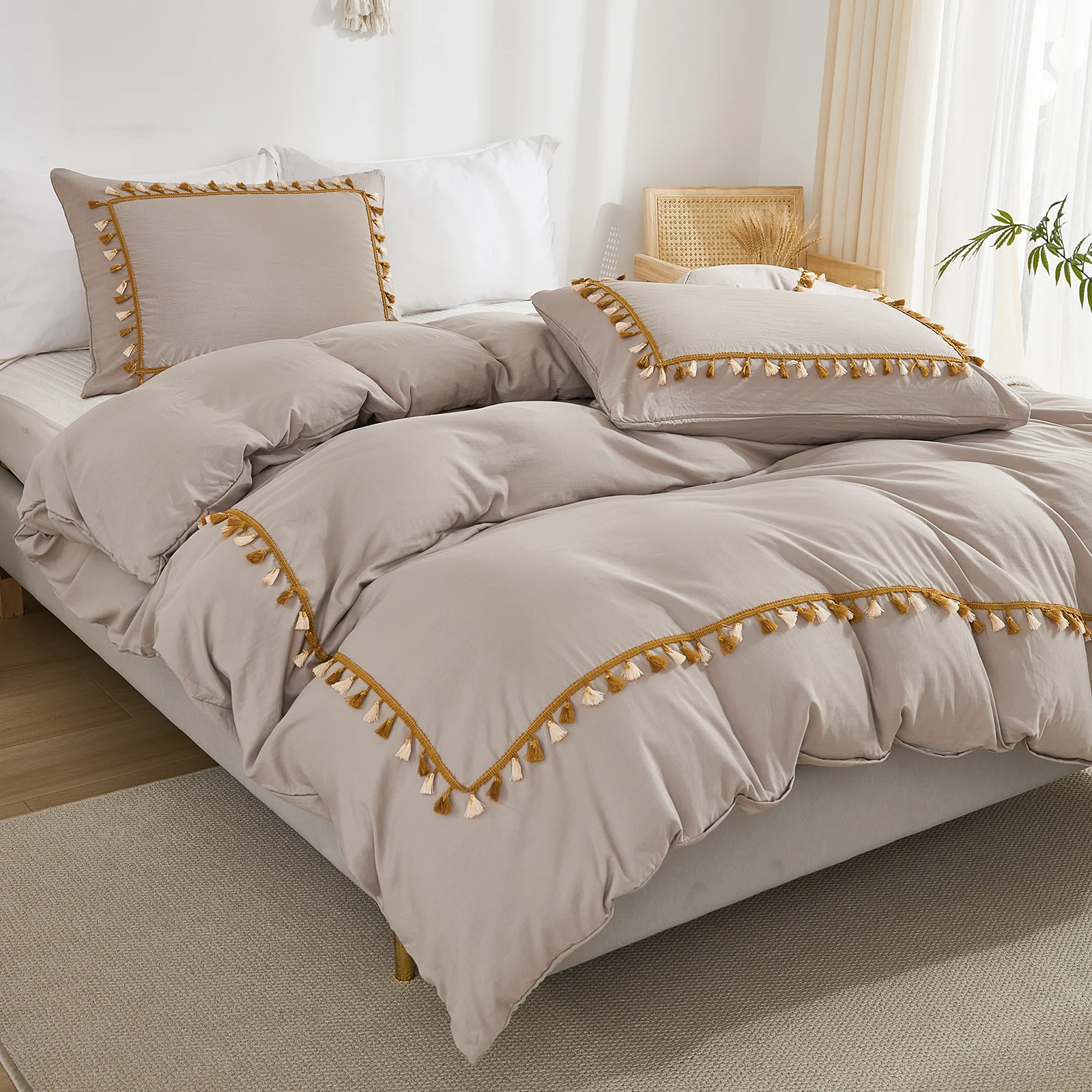 3PCS White And Khaki Duvet Cover Set Tassel Comforter Cover Tassel Country Bed set soft lightweight Down Bedding Set for