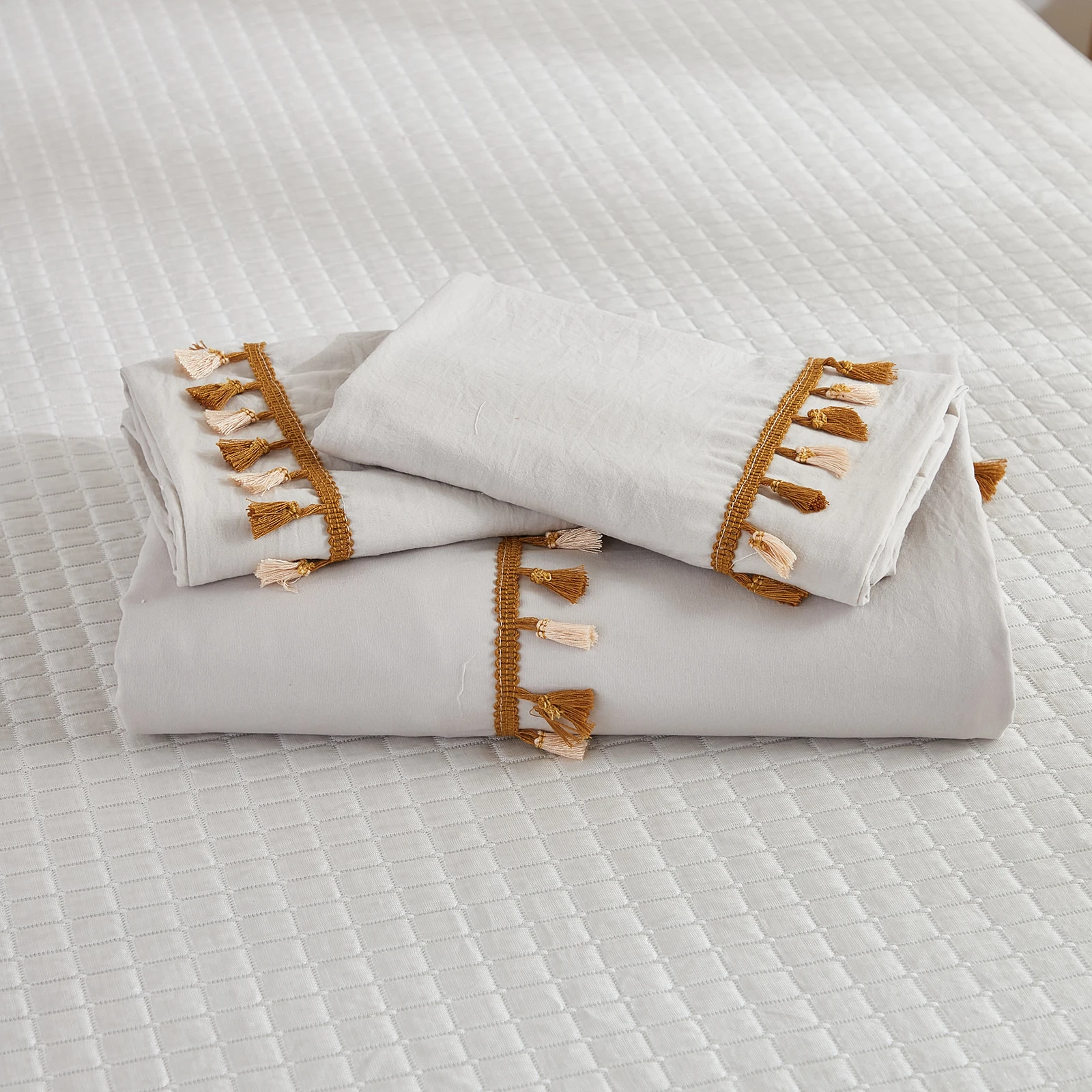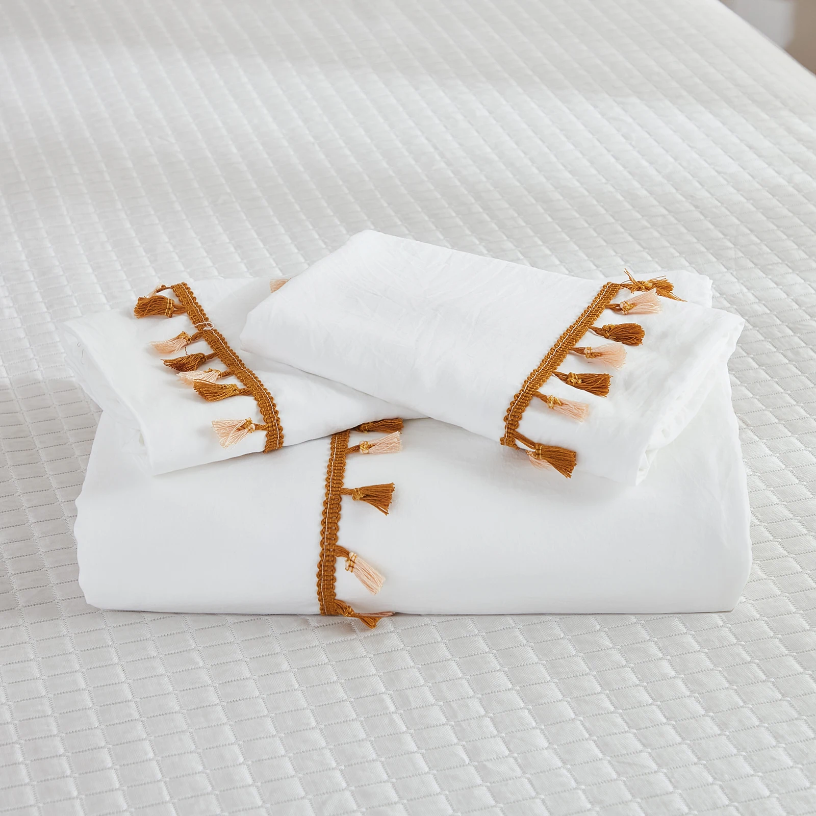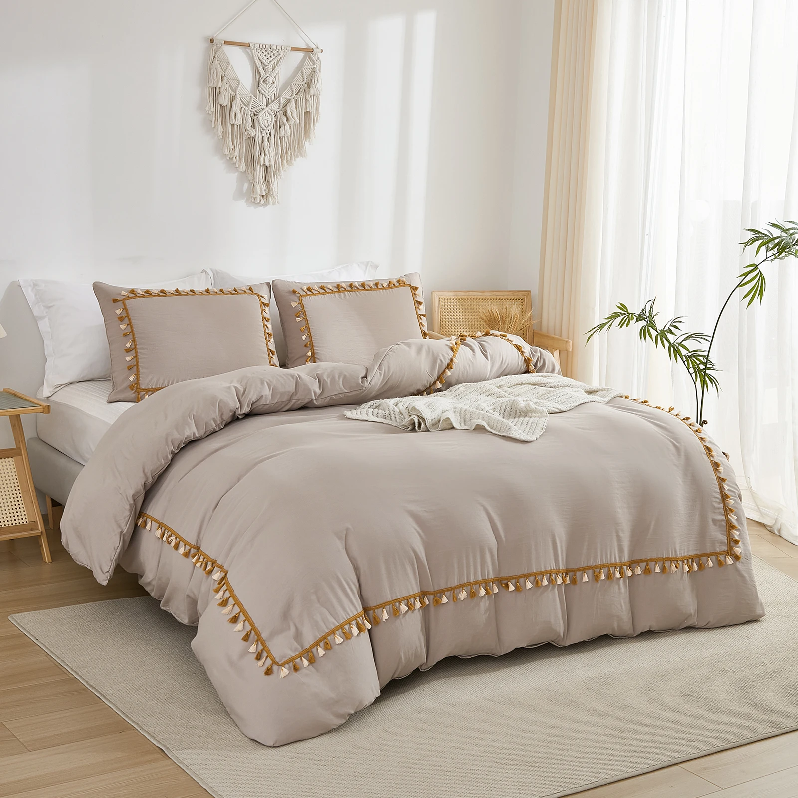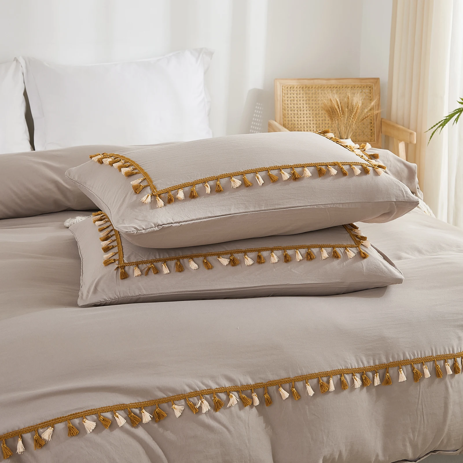 3PCS White And Khaki Duvet Cover Set Tassel Comforter Cover Tassel Country Bed set soft lightweight Down Bedding Set for