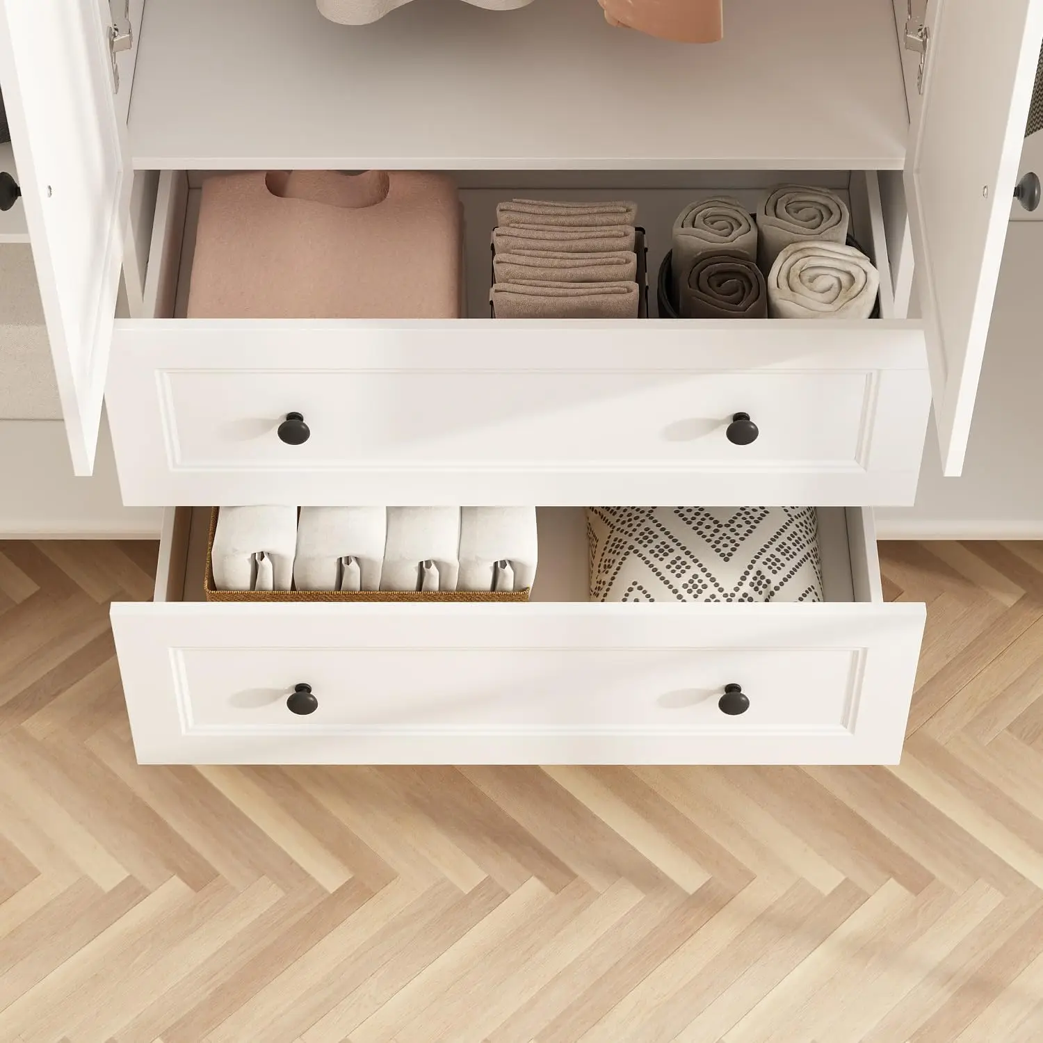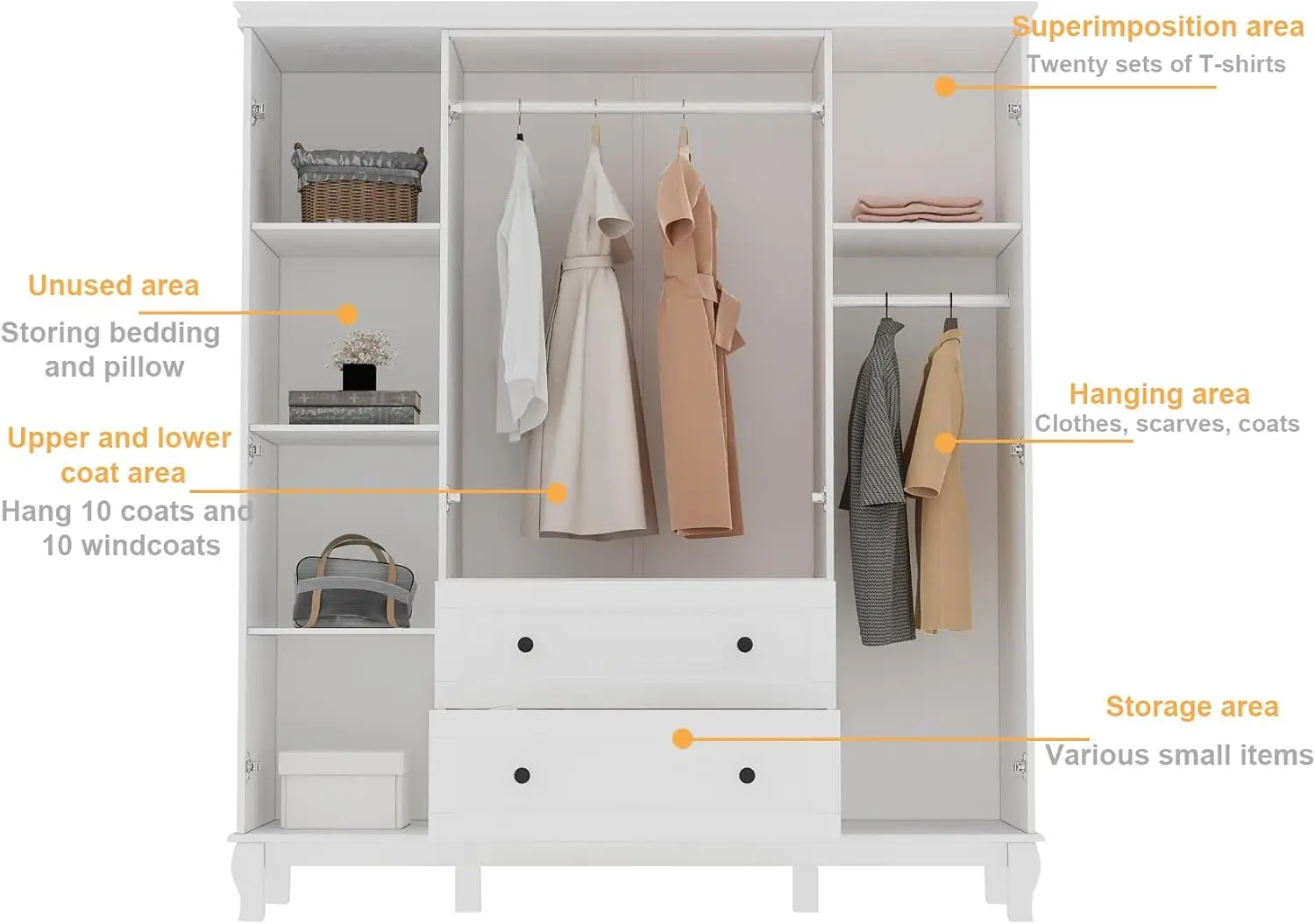 - 【Elegant Wardrobe】 – This 4 doors white wardrobe with drawers combines clean white panels with black handles, the stylish carved legs and doors are showing elegant charm. This wardrobe matches well with many different house decors