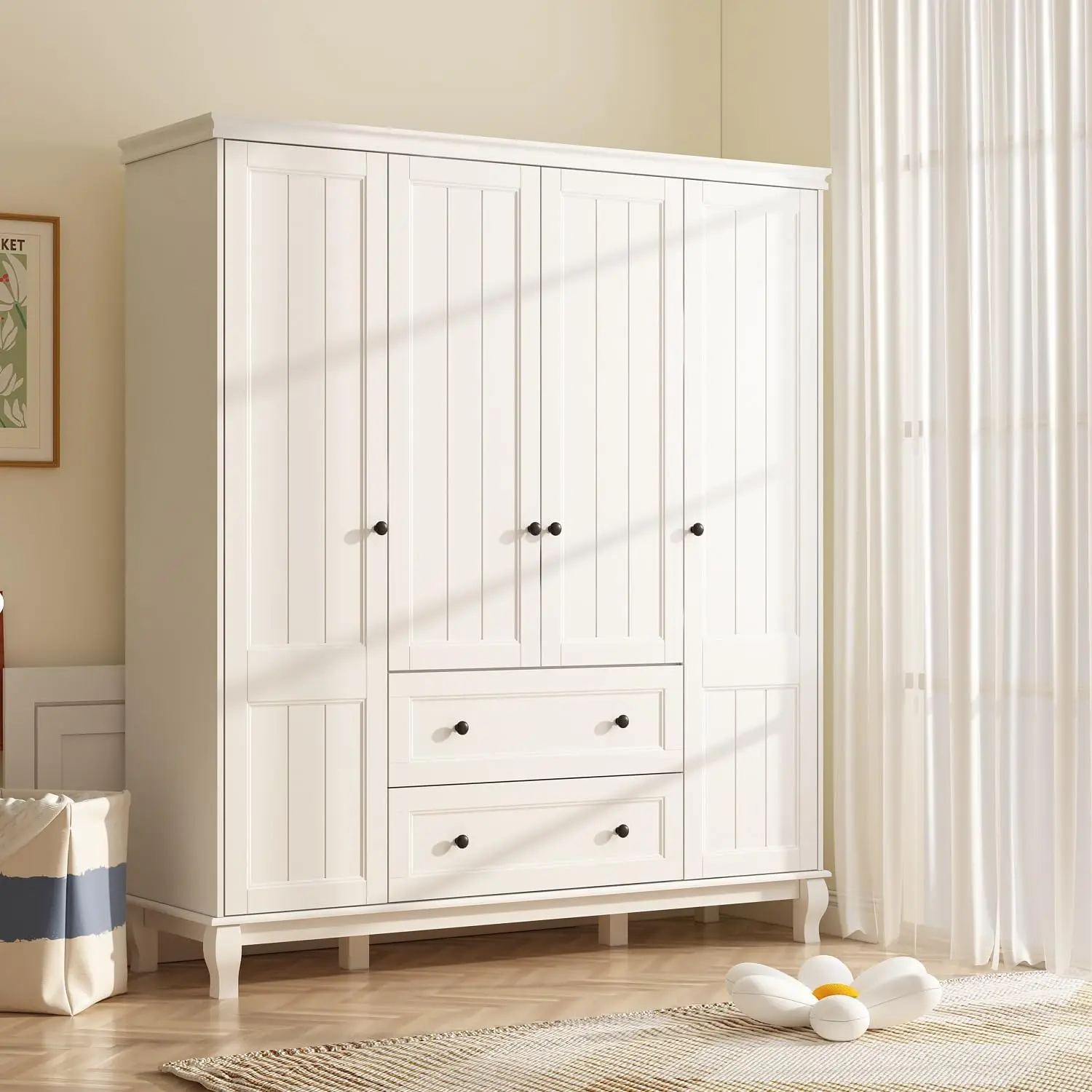 4 Door Wardrobe Closet Armoire with 2 Drawers, Hanging Rods & Multi-Tier Storage Shelves, Wood Storage Cabinet with Solid Legs