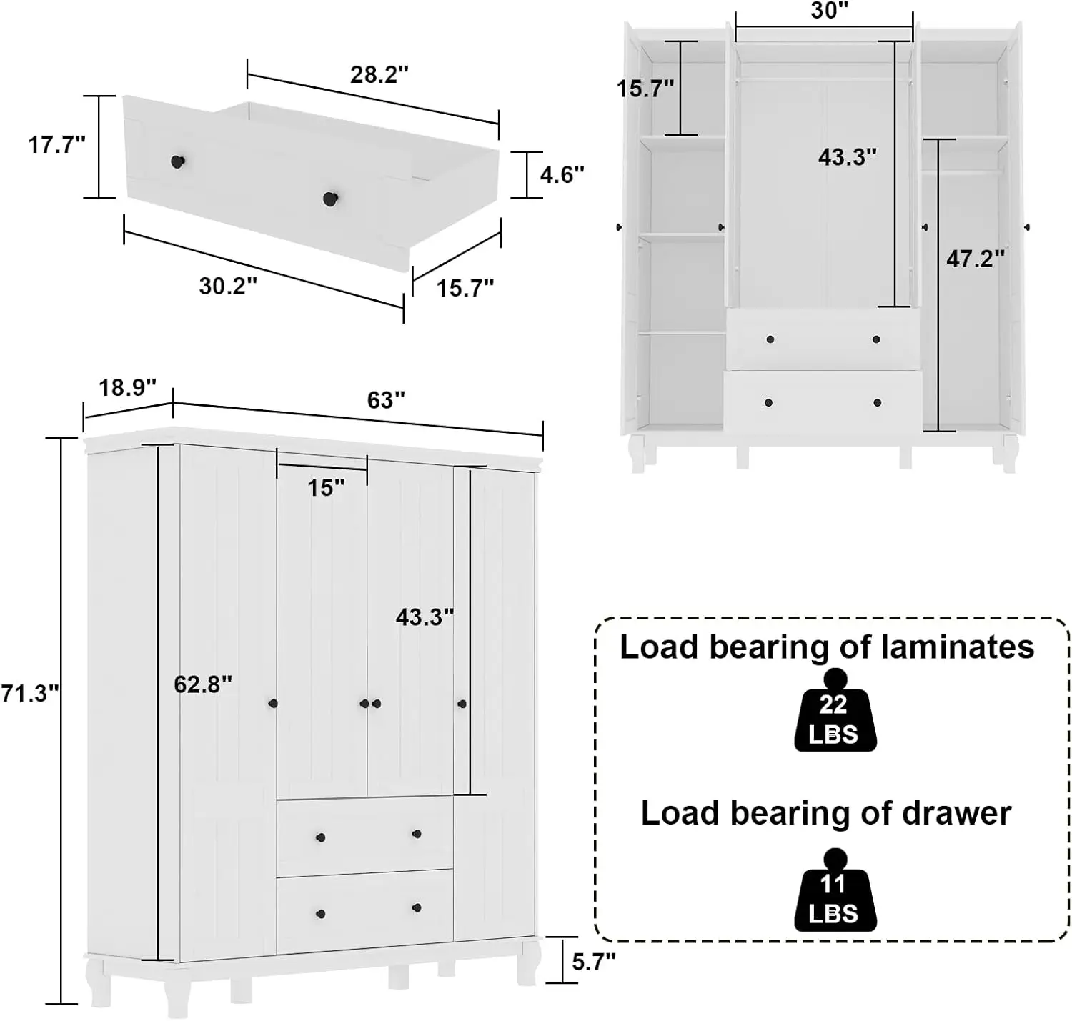 - 【Dimensions & Assembly】 – Overall dimensions: 63”W x 18.9”D x 71.3”H. Assembly required, this wardrobe with doors and shelves comes with all necessary instructions and hardware in 2 boxes, please assemble it with at least 1-2 people due to the size of this item