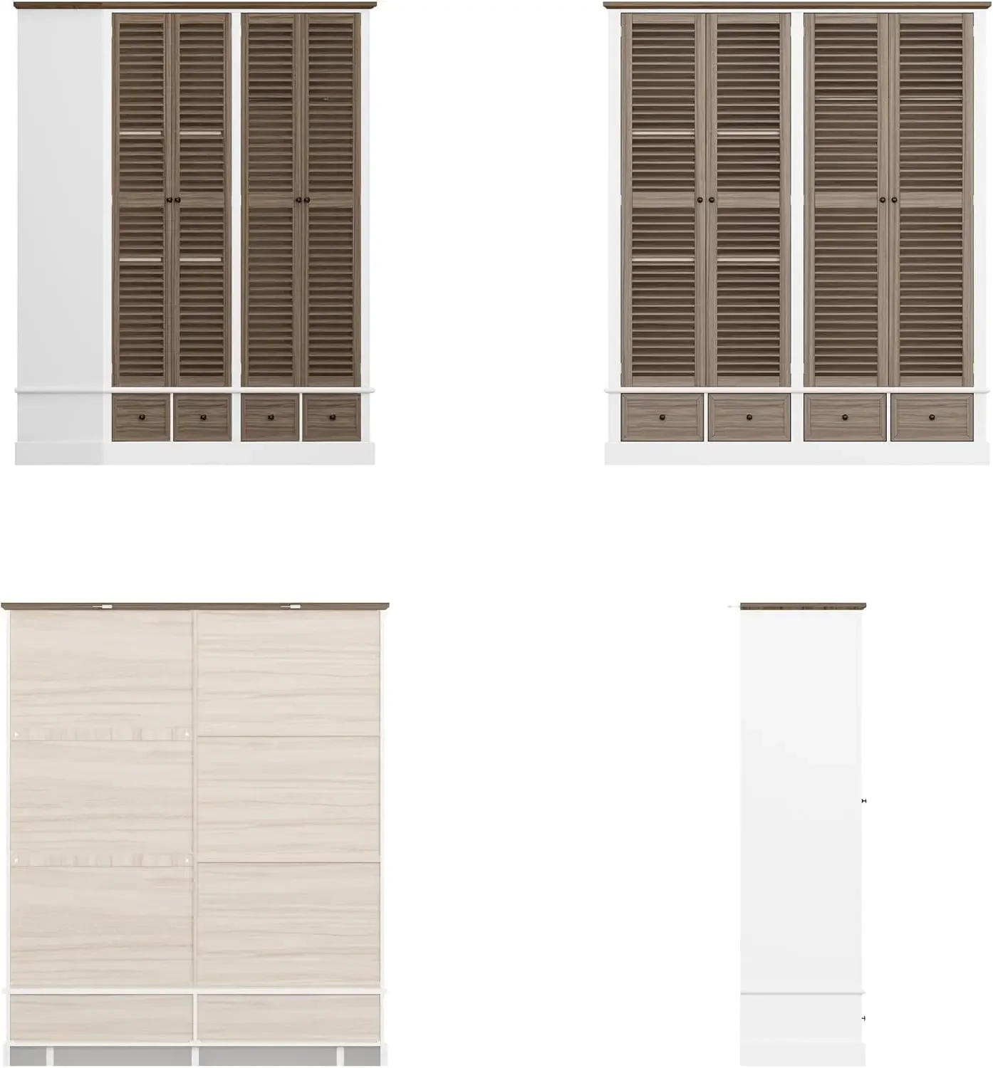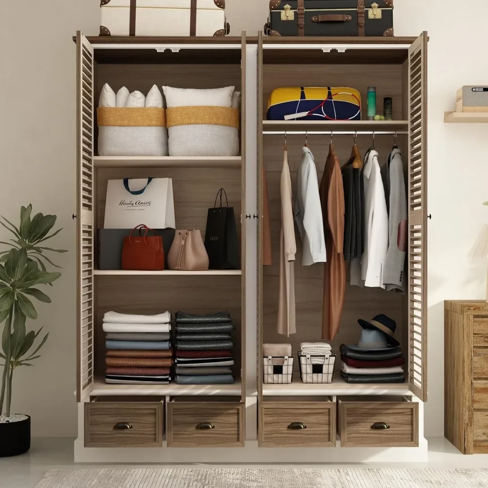 4 Doors Wardrobe Armoire with Louver Doors, Storage Shelves, 4 Drawers & Hanging Rod