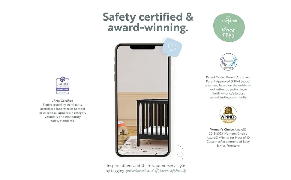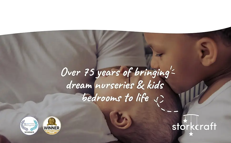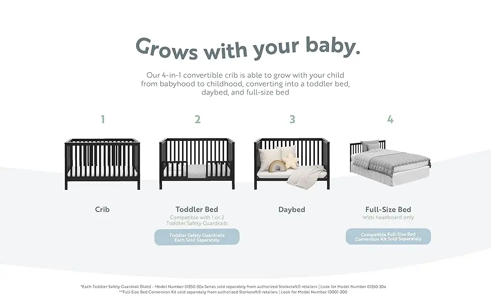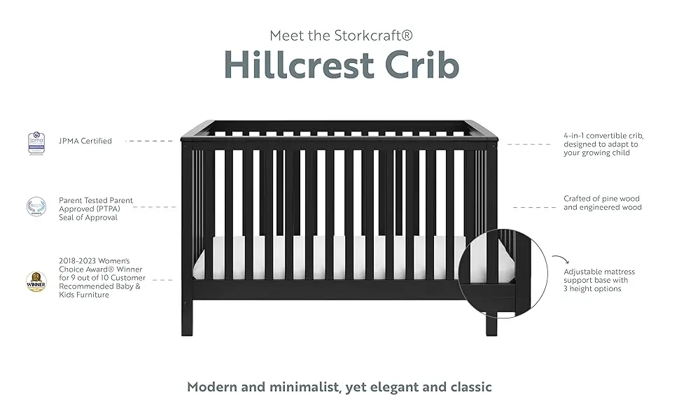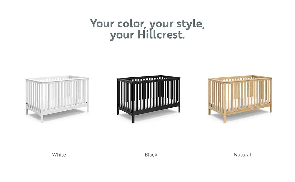Bring your dream nursery to life with the Storkcraft Hillcrest 4-in-1 Convertible Crib. With its timeless, versatile design and classic details, the Hillcrest is the perfect addition to any nursery – no matter your style. The Hillcrest is crafted from pine wood and engineered wood, and its applied finish has been tested to meet or exceed the applicable ASTM and CPSIA safety standards. The Hillcrest is JPMA Certified – meaning it’s been expert tested by third-party, accredited laboratories to meet or exceed all of the applicable category voluntary and mandatory safety standards. Designed to adapt to your growing baby, the Hillcrest is equipped with an adjustable mattress support base with 4 different height options so the mattress support base’s position can be lowered as your child grows (please note, this crib may only be used until your child can easily climb out or is taller than 35 inches (89 cm). To support your child’s journey from babyhood to toddlerhood (and beyond), the Hillcrest is able to be converted from a baby crib to a toddler bed [compatible with 1 or 2 toddler safety guardrails, each sold separately. Look for Graco Universal Toddler Safety Guardrail (Slats) – Model Number 01350-30x Series], daybed, and full-size bed with headboard only [compatible with full-size bed conversion kit, sold separately. Look for Graco Full-Size Bed Conversion Kit – Model Number 10001-200]. The Storkcraft Hillcrest 4-in-1 Convertible Crib is designed to accommodate any standard full-size crib & toddler mattress (mattress sold separately). Storkcraft is the proud recipient of the Parent Tested Parent Approved (PTPA) Seal of Approval for nursery and children’s bedroom furniture, and the Women’s Choice Award for 9 out of 10 Recommended Baby & Kids Furniture from 2018-2023. Backed by a 1-year limited manufacturer’s warranty. Assembly required. Mattress, toddler safety guardrails, and full-size bed conversion kit each sold separately. Assembled dimensions: H (34.00 inches) x L (30.71 inches) x W (54.73 inches).