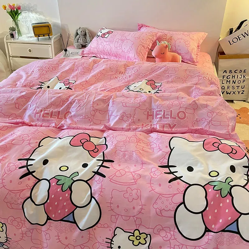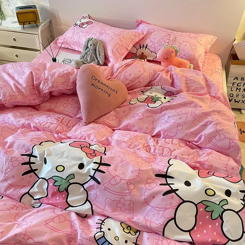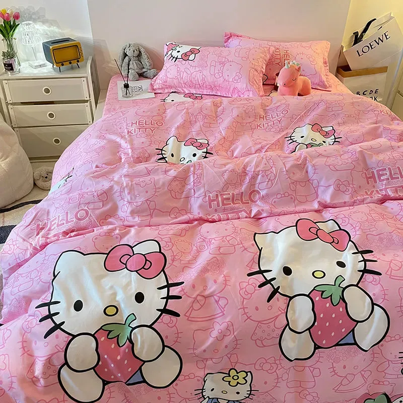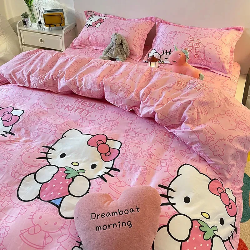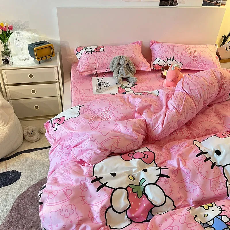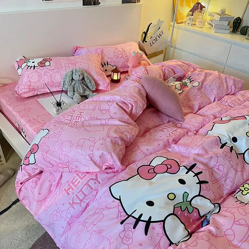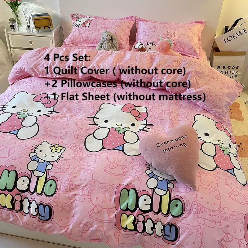 4 Pcs/Set Cute Cartoon Hello Kitty Queen Size Bed Set Quilt Cover Flat Sheet and 2 Pcs Pillowcases Pink Princess Dorm Suit