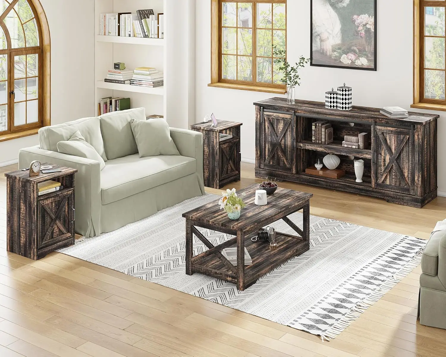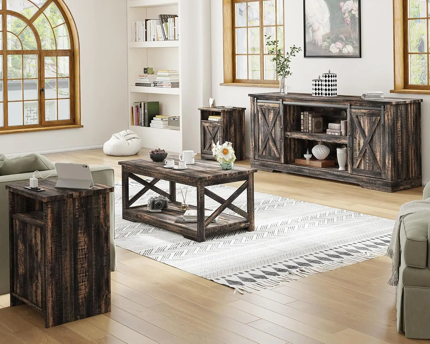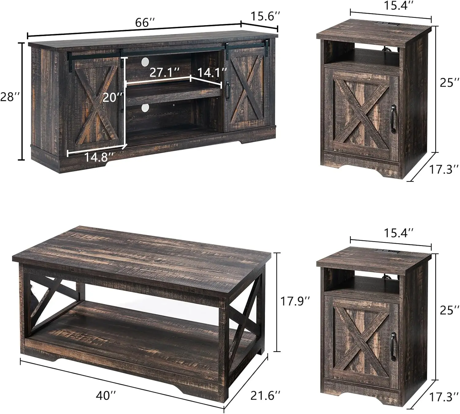 4-Piece Farmhouse Table Set Includes Sliding Barn Door TV Stand Coffee Table& Two End Tables Side Table with Charging Station