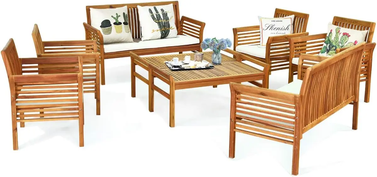 4 Piece Outdoor Acacia Wood Sofa Set with Water Resistant Cushions, Padded Patio Conversation Table Chair Set W/Coffee Table
