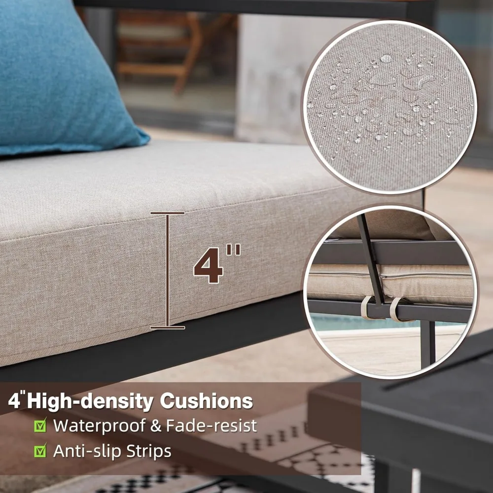 • 4″ THICK DEEP SEATING CUSHION:The outdoor furniture set is padded with upgraded fillings, providing good support and maintain shape after use. The fabric on the cushions is removable and washable. Also the cushions have the Velcro to affix them to the frame, keeping them from sliding around