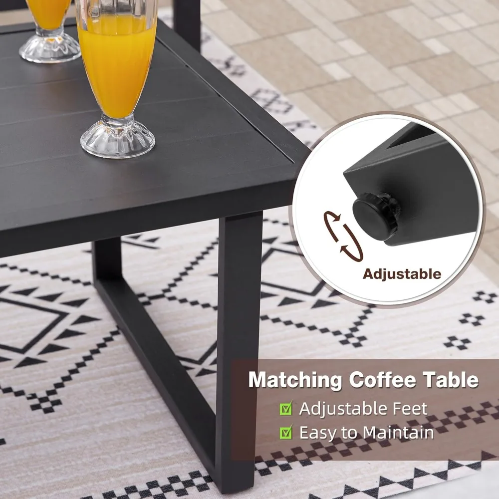 • MODERN AND STYLISH DESIGN:The outdoor conversation set features black-grey metal frame with the touch of modern finish. The arms include heat-treated wood grain coating that give the set a clean and minimalistic look. Also the furniture pieces are light weight and easy to move as needed4 Pieces Outdoor Patio Furniture with Coffee Table,Metal  Conversation Sets with Washable and High-Resiliency Sponge Cushions