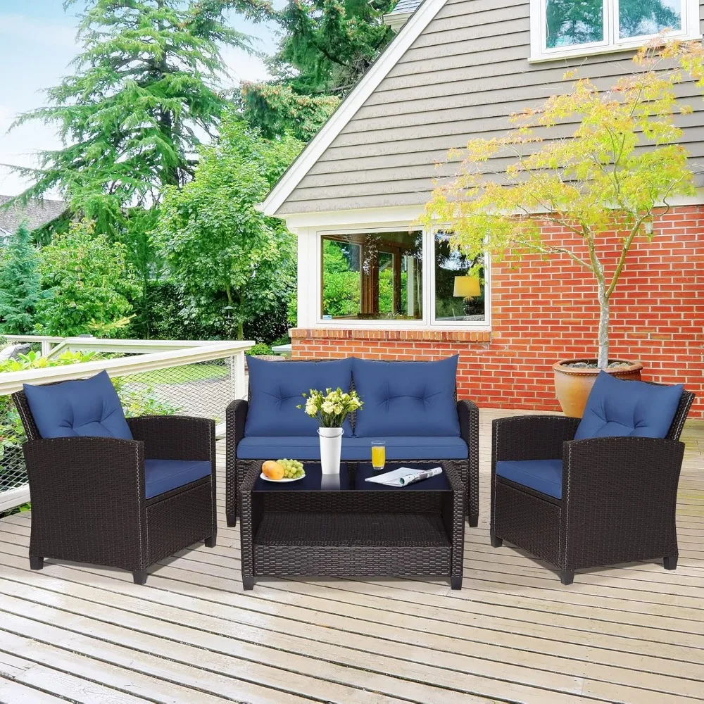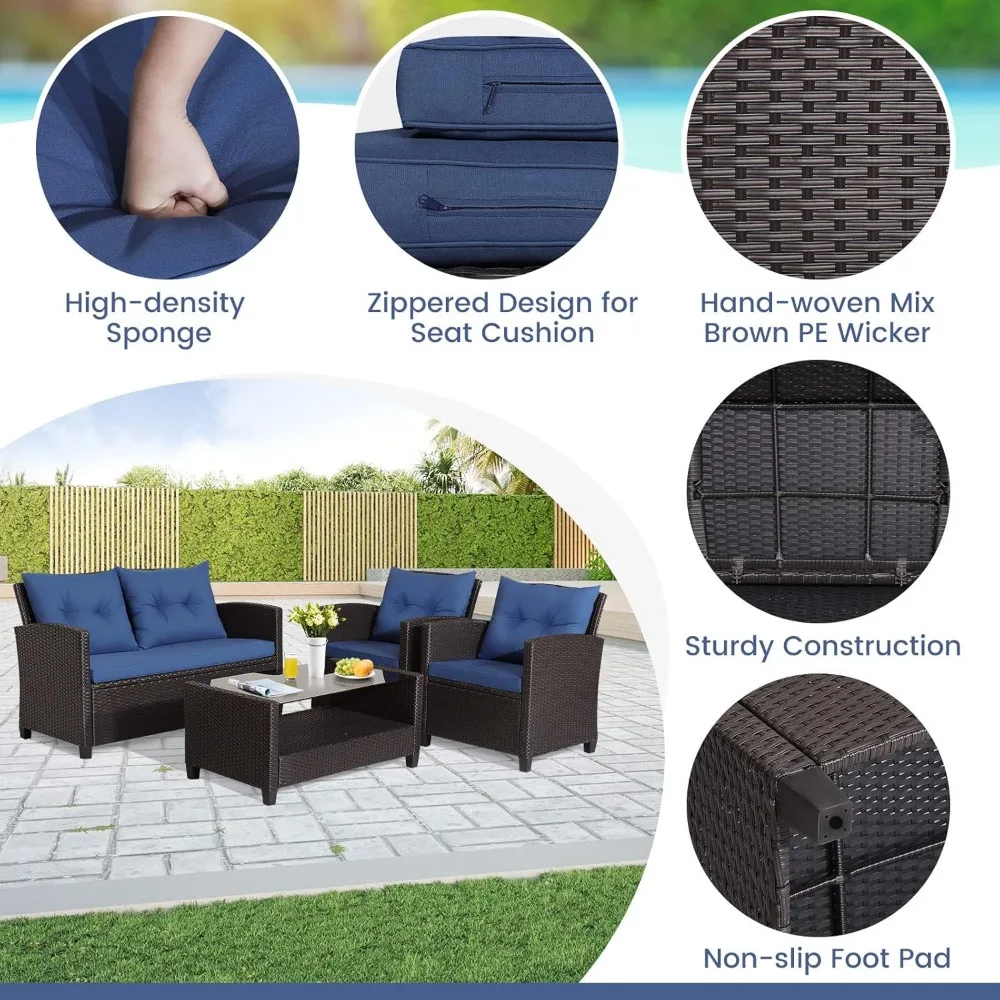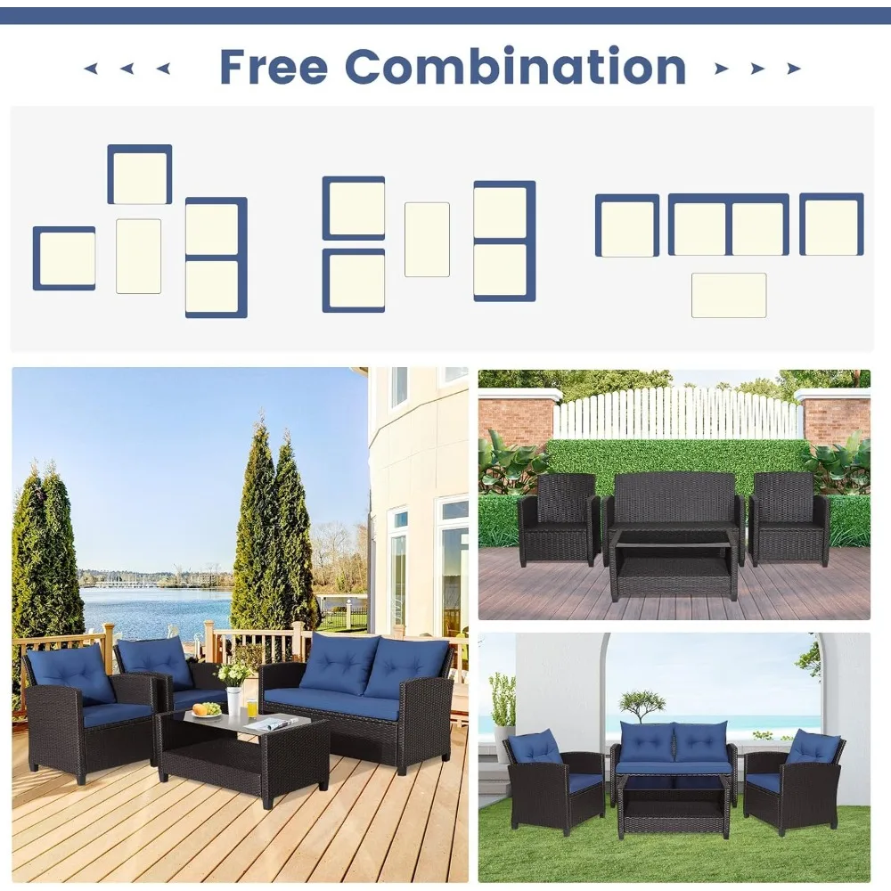 - 【Versatile Combination Setting】 Our four-piece rattan sofa set includes 2 single sofas, a loveseat and a coffee table with tempered glass countertops. It allows to be pieced together in any combination to suit your needs and match your space. A practical compartment is designed under the table to increase storage space.