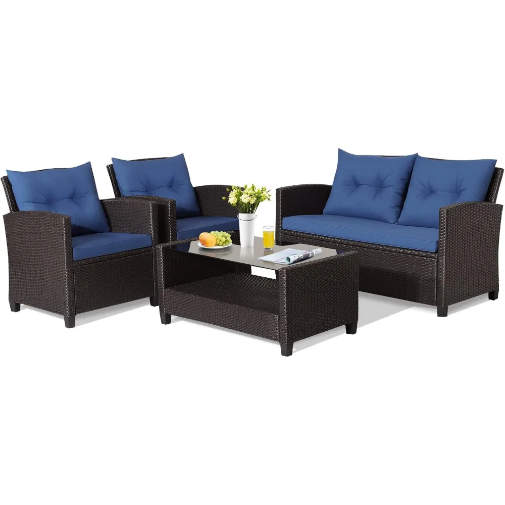 4 Pieces Patio Furniture Set Outdoor PE Rattan Conversation Set with 2-Tier Coffee Table, Extra Storage Shelf and Cushions