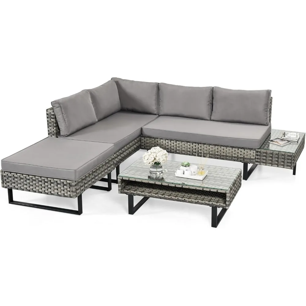 4 Pieces Patio Furniture Set, Outdoor Rattan Conversation Sectional L-Shaped for Patio Backyard Poolside Porch