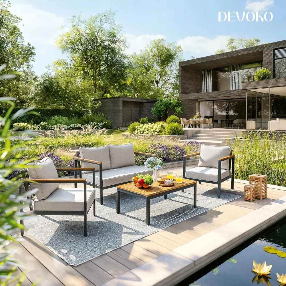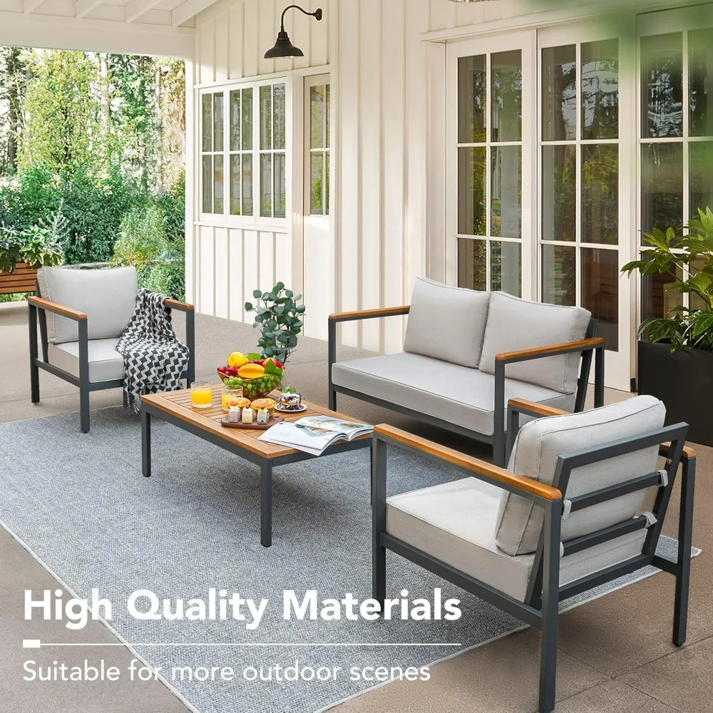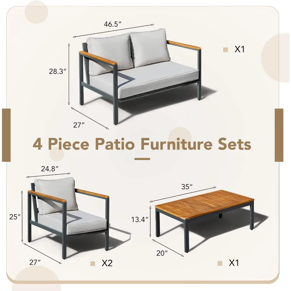 4 Pieces Patio Furniture Sets Outdoor Conversation Set Acacia Wood Sofa Set with Coffee Table Thicker Sponge Cushion