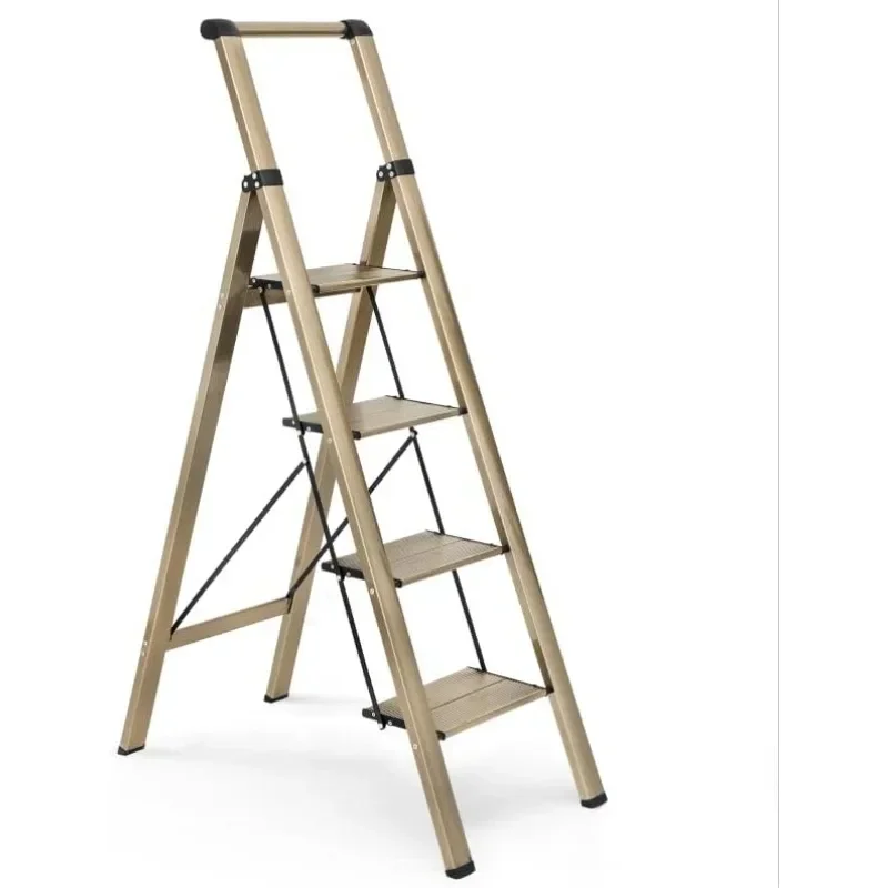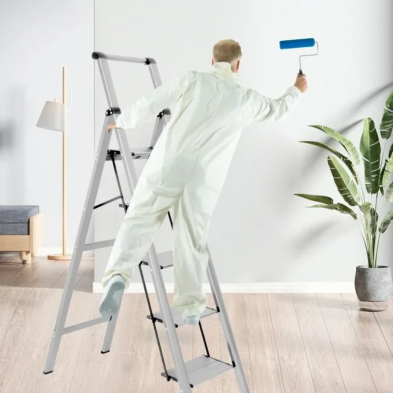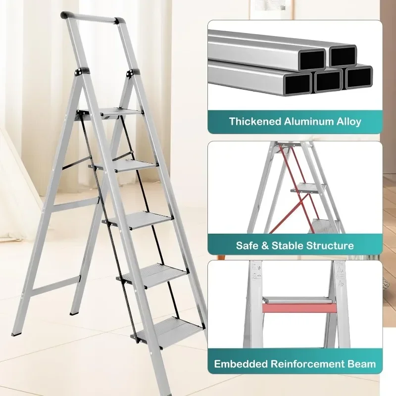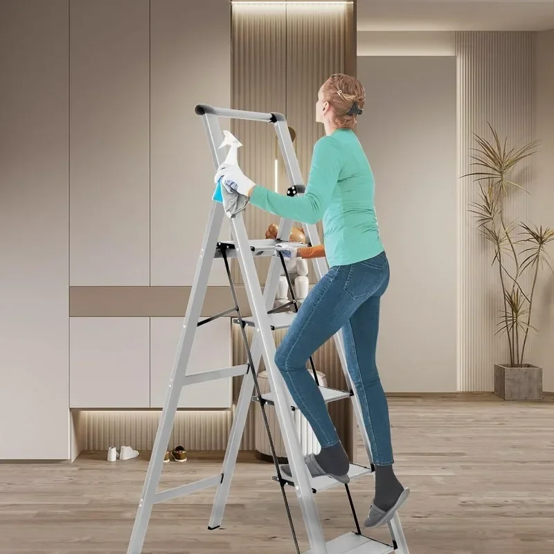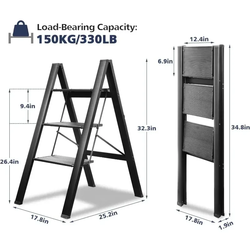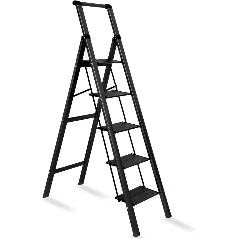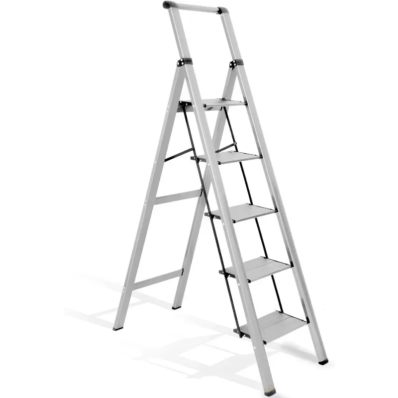 - : Top handle provides extra stability when going up and down the ladder. Triangular stabilizing structure and embedded reinforcement beams ensure safe use. Sturdy yet lightweight aluminum alloy makes the step ladder easy to carry. Supports a maximum load capacity of 330 lbs.