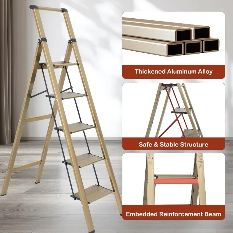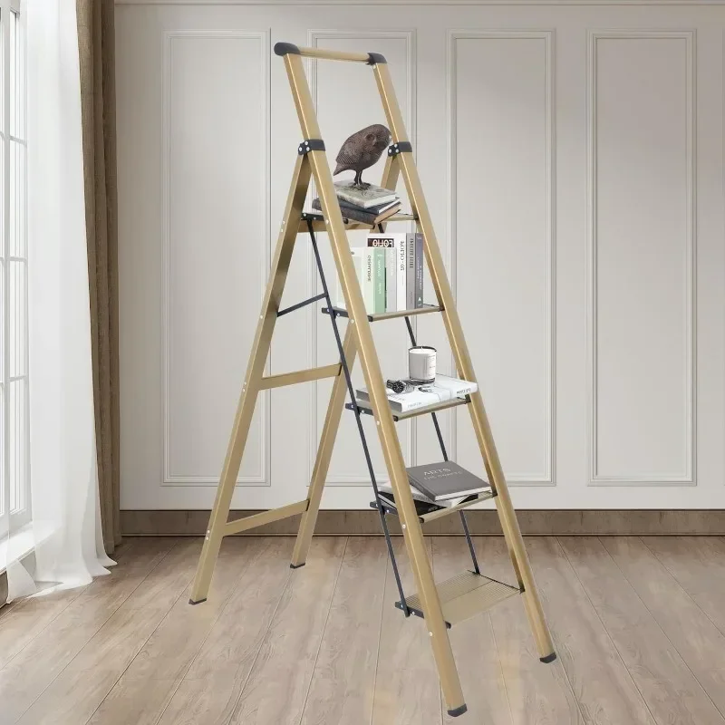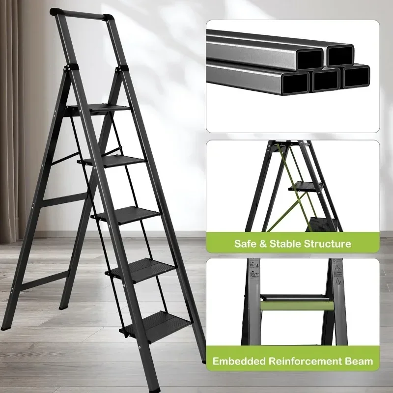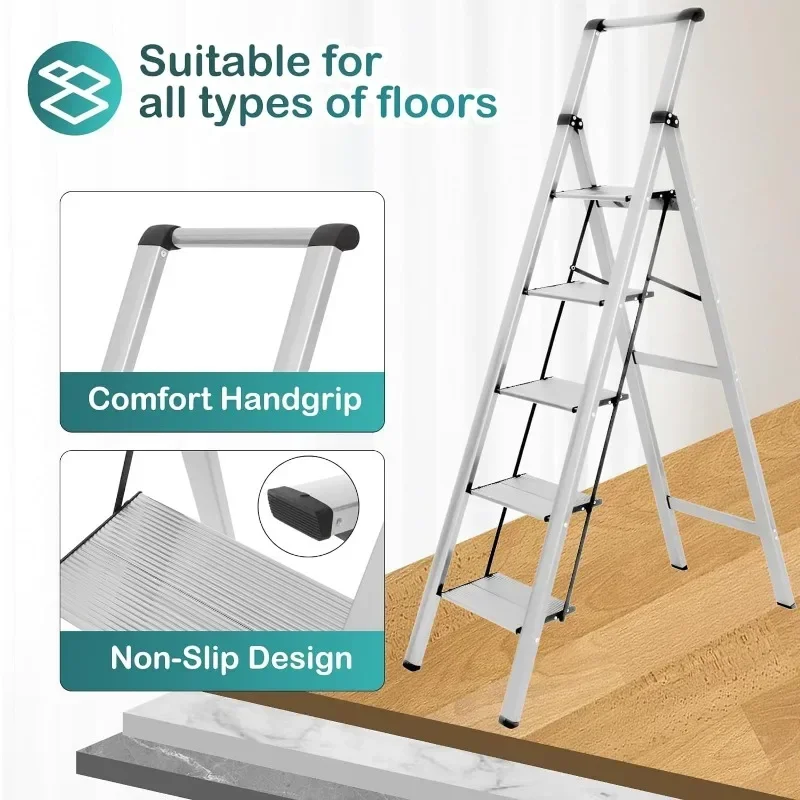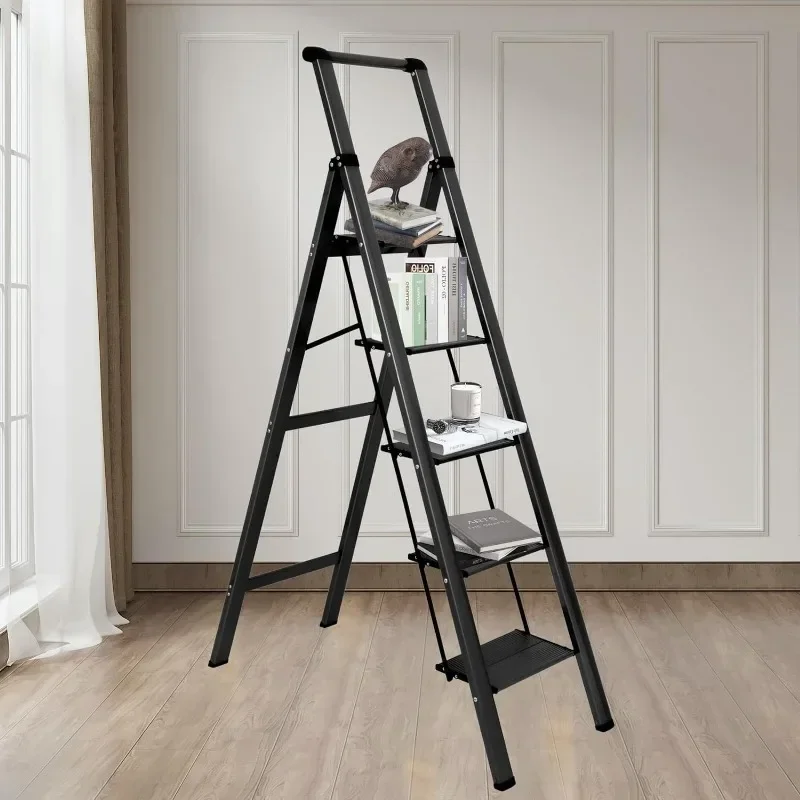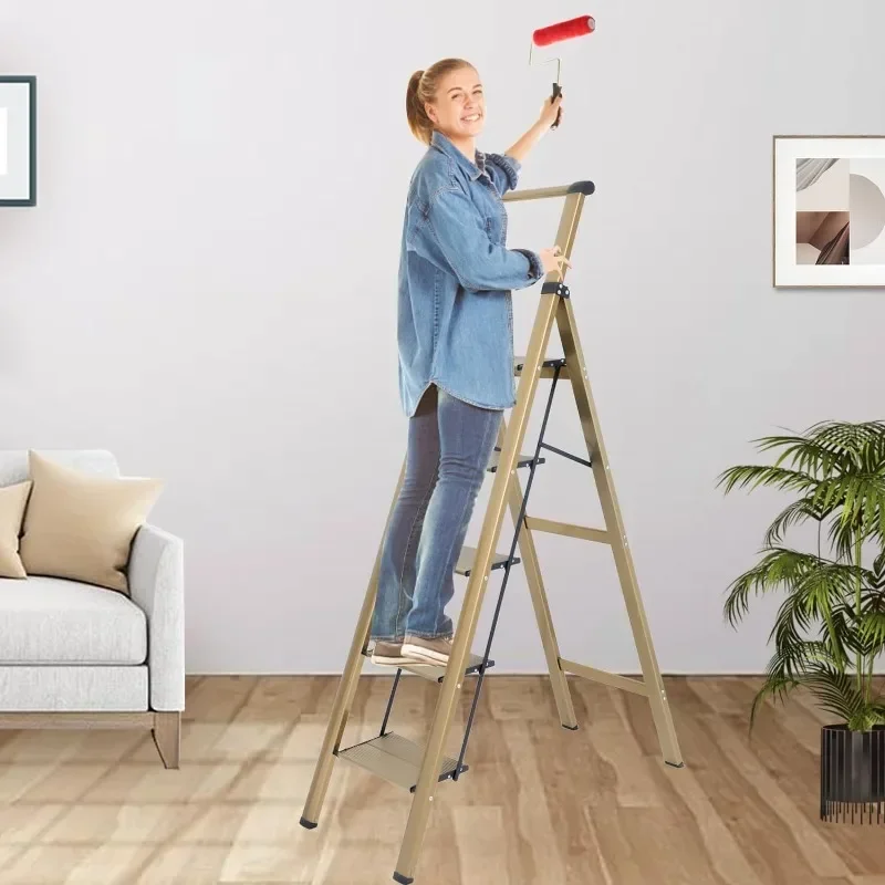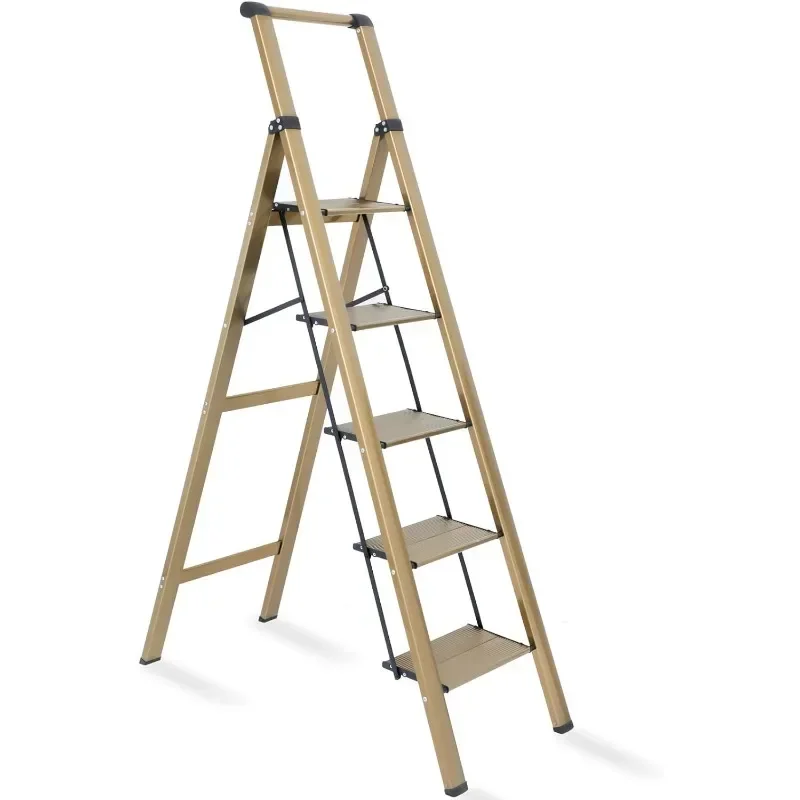 - : Top handle provides extra stability when going up and down the ladder. Triangular stabilizing structure and embedded reinforcement beams ensure safe use. Sturdy yet lightweight aluminum alloy makes the step ladder easy to carry. Supports a maximum load capacity of 330 lbs.
