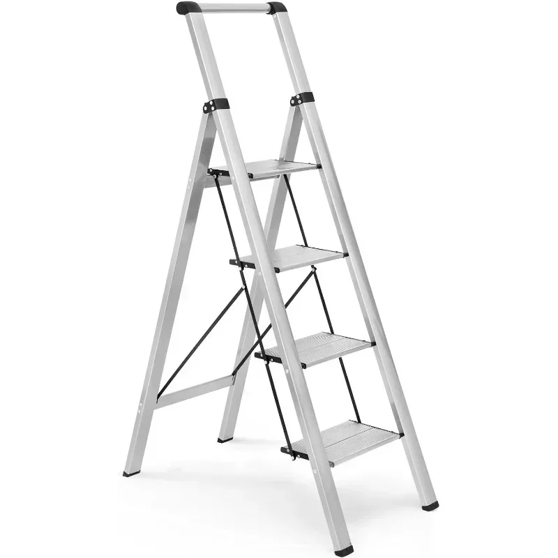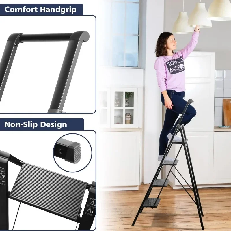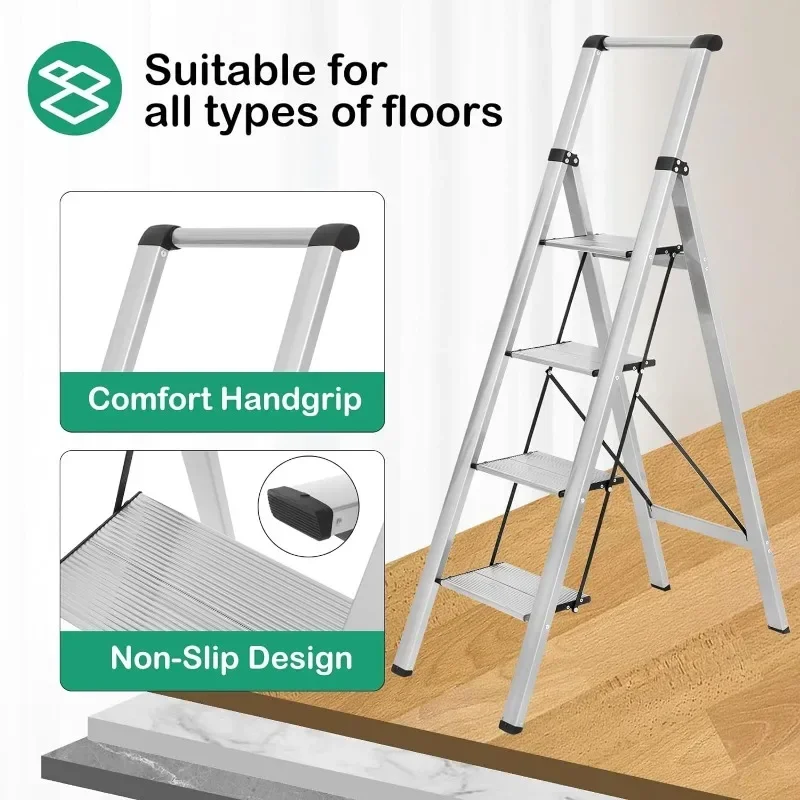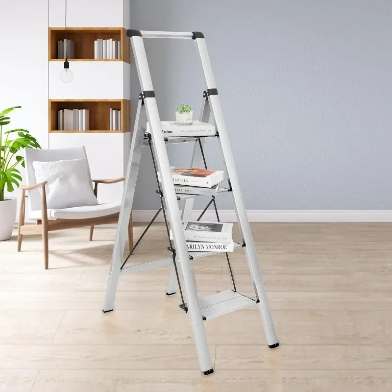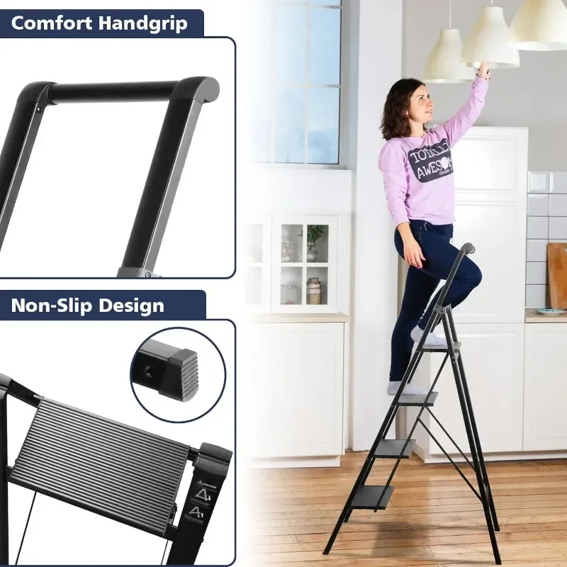 4 Step Ladder, Aluminum Folding Steps Stool with Convenient Handgrip, Lightweight Ladders with Anti-Slip Sturdy Pedal