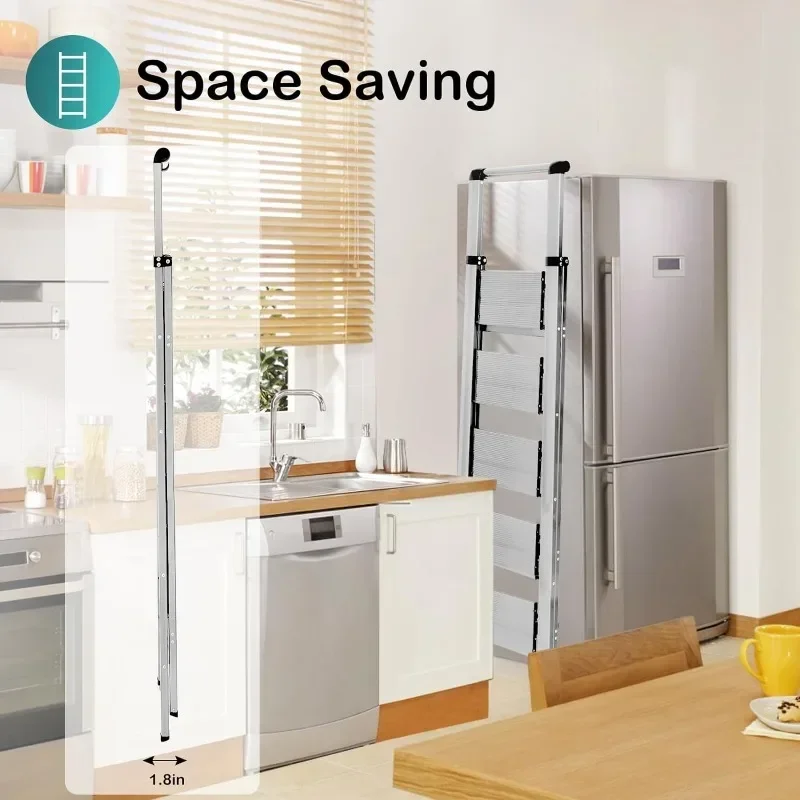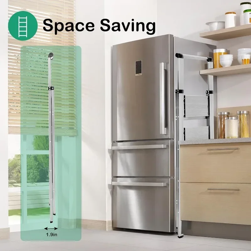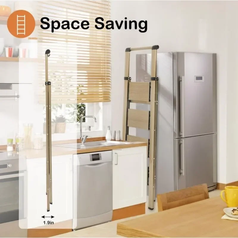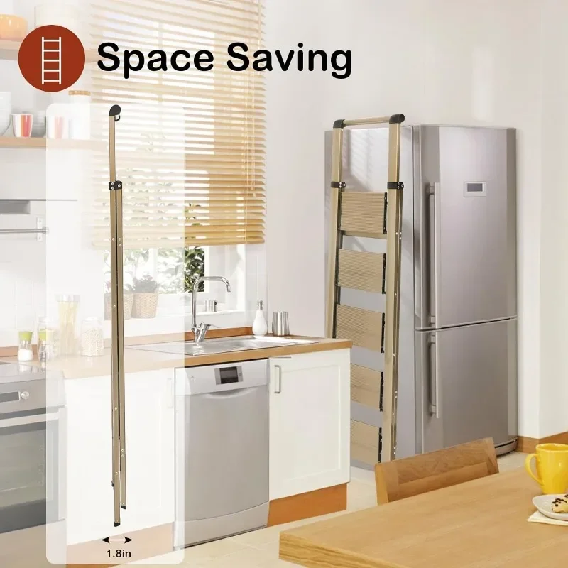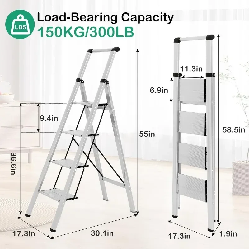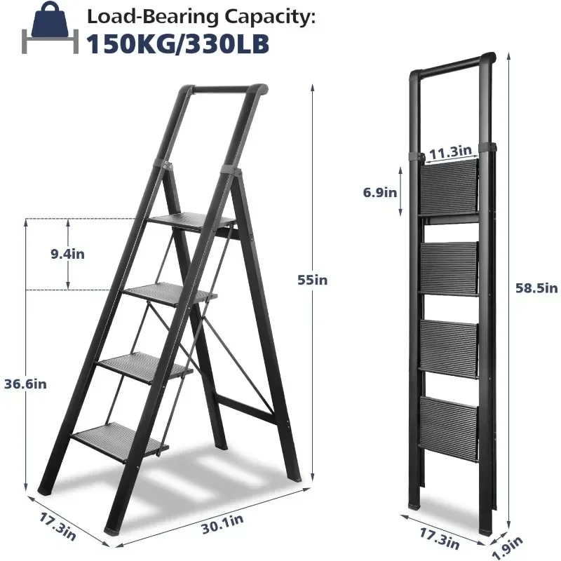 - & �� ����】: Easy-to-fold ladder is lightweight and easy to carry. It can be raised with one hand. The compact ladder is easily stored in tight corners, under beds and sofas, or in the trunk. 4 Step Ladders Unfolded: 55″H X 18.1″W X 30.1″D, Folded: 58.5″H X 17.3″W X 1.9″D, Net Weight: 11.7 lbs.