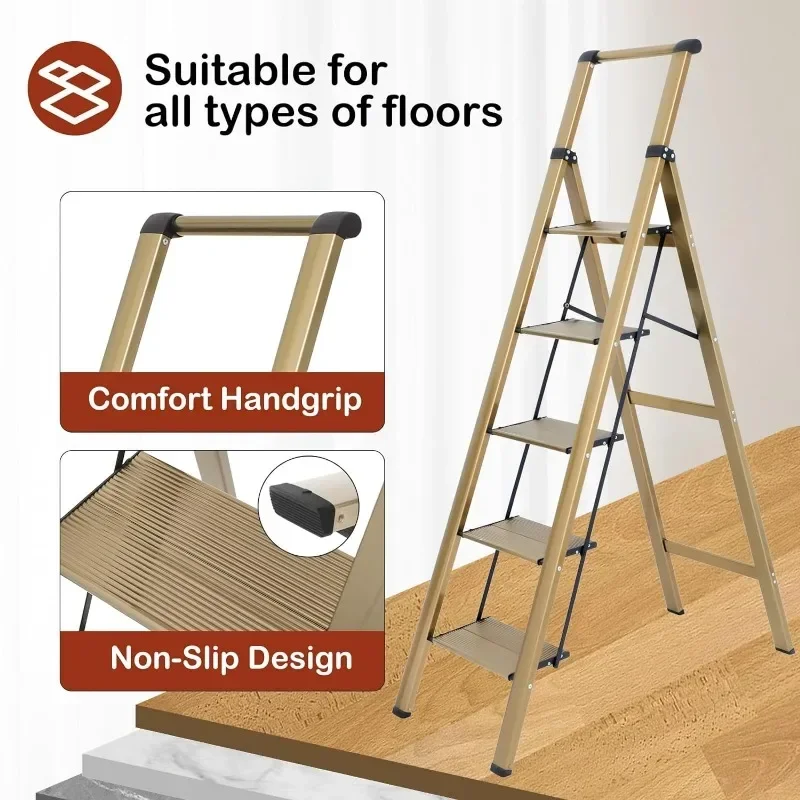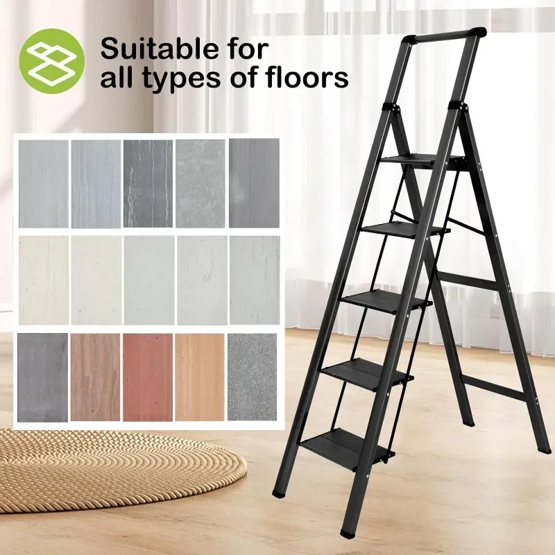 - – : Thickened pedals provide strong support for the soles of the feet. Non-slip pedals are designed to ensure maximum safety during use. 4 large PVC foot covers provide a sturdy stand for the ladder and protect your floor from scratches. So this is also a children’s step stool.