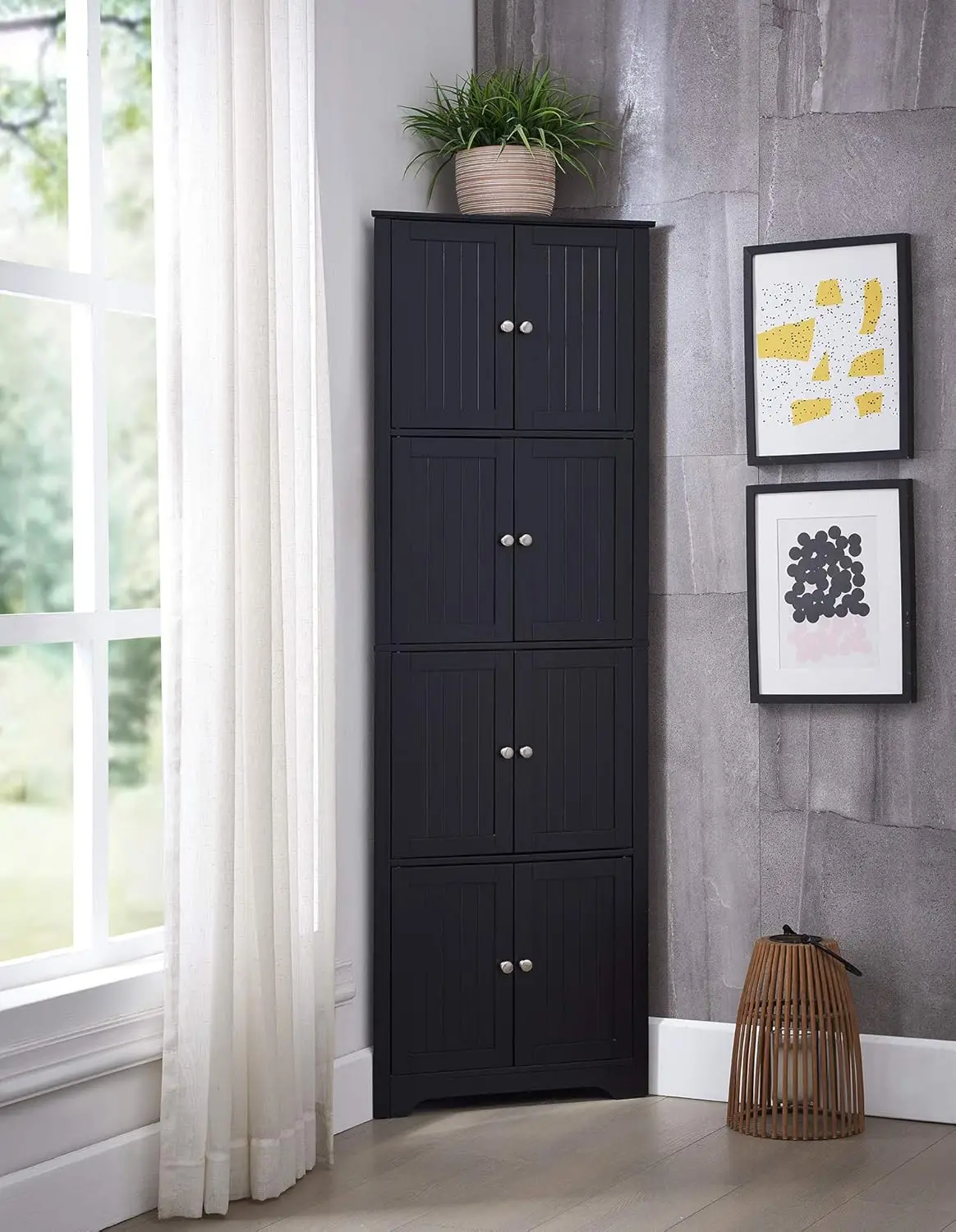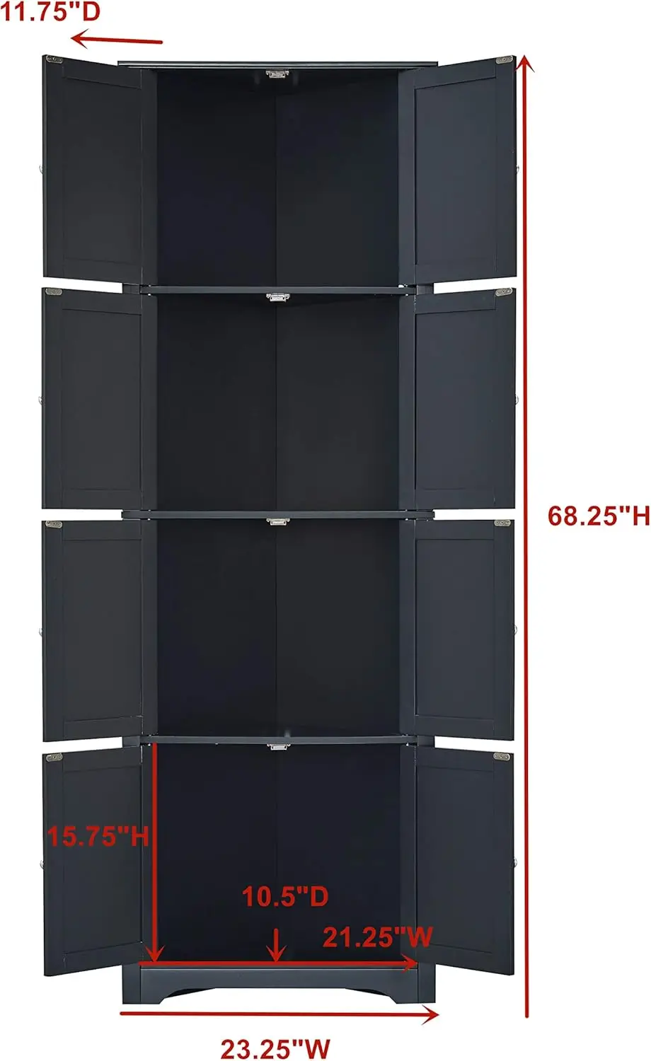 - Measuring 23″W x 12″D x 68″H, this corner cabinet fits perfectly in any kitchen or dining room corner