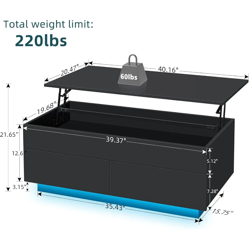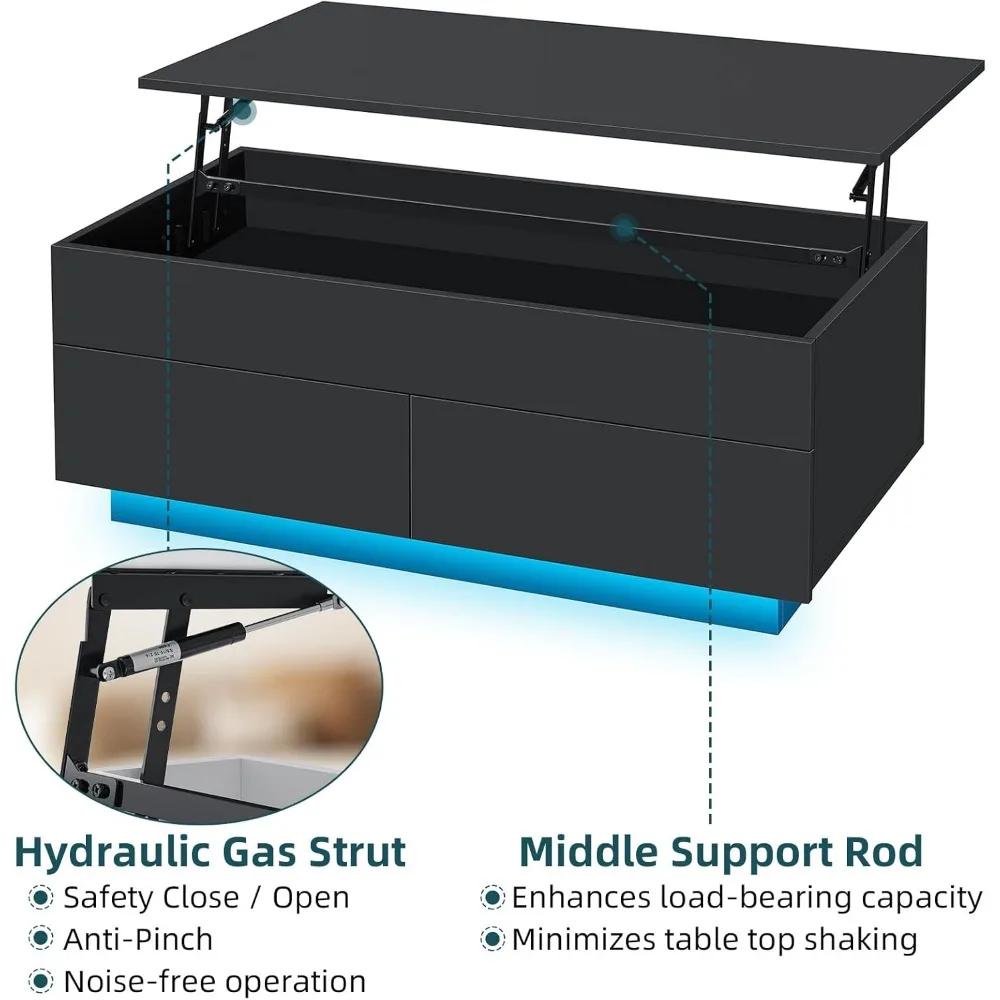 40” Lift Top Coffee Table for Living Room, Black Coffee Tables with Storage, LED Modern Coffee Table Rectangular Black Gloss