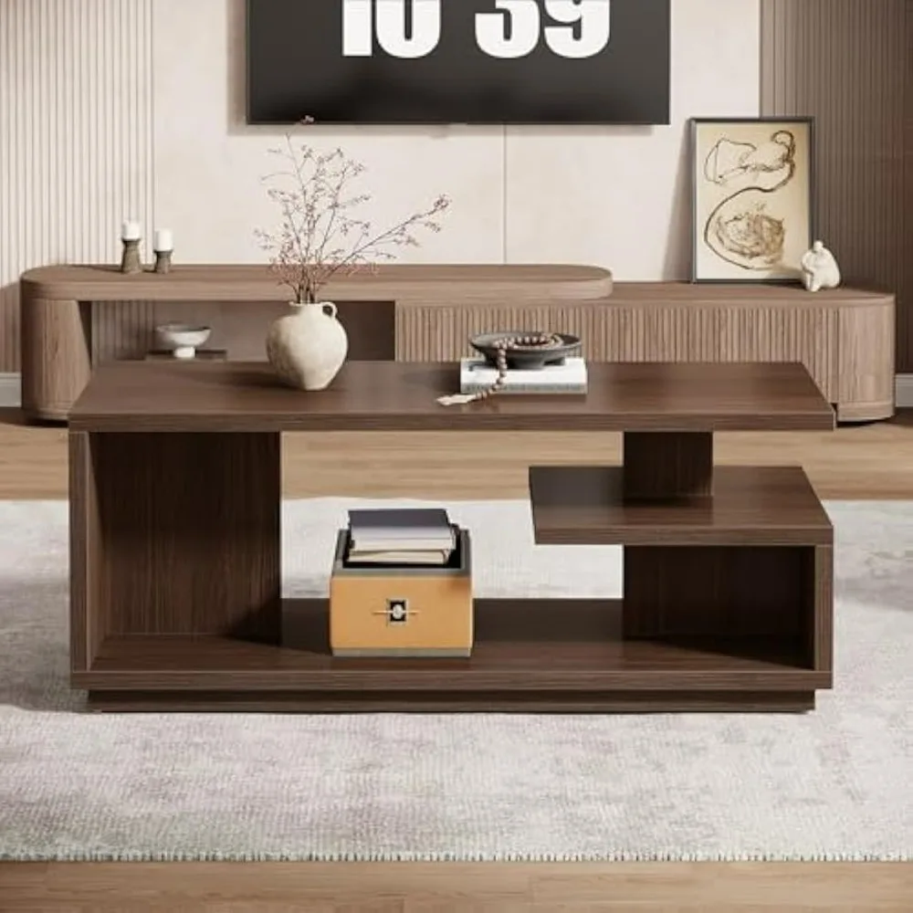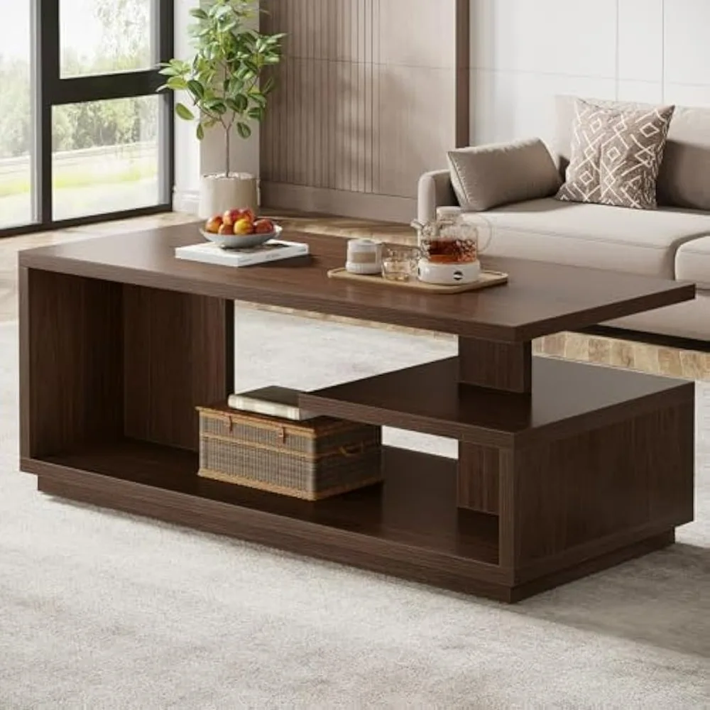 47.24″ Coffee Table with Storage Shelf, Mid-Century Modern Center Table, 3-Tier Rectangle Wooden Tea Table with Thick Base