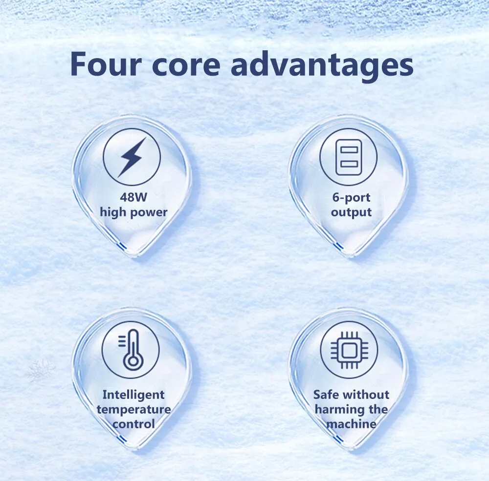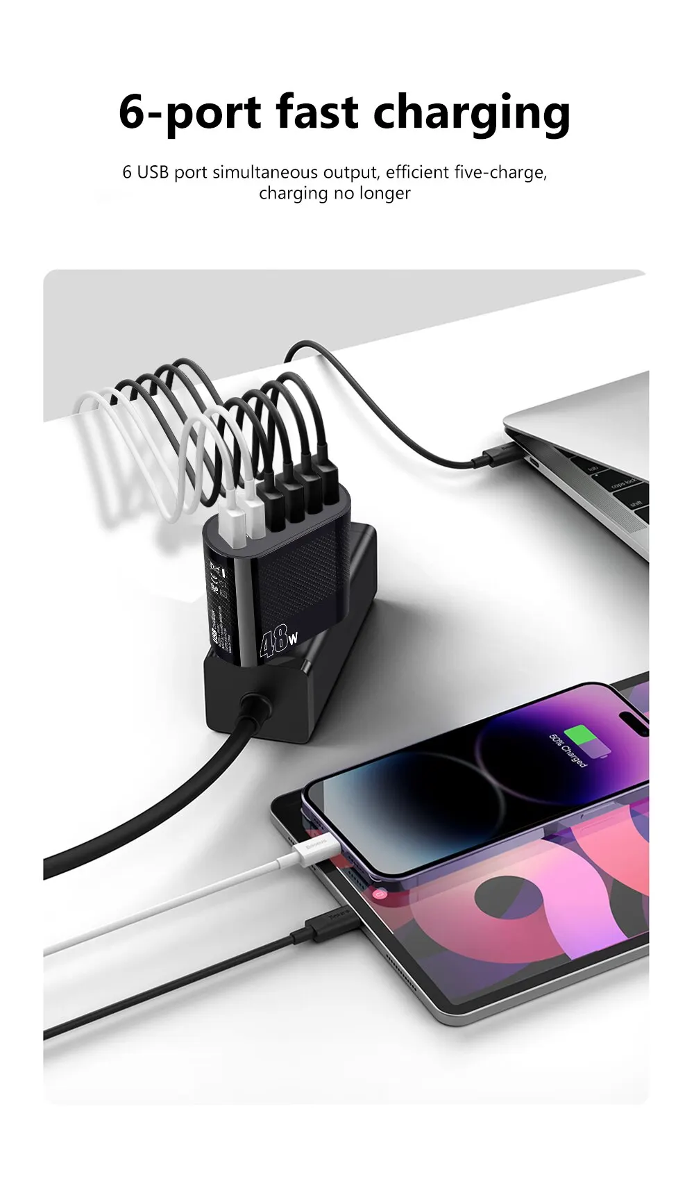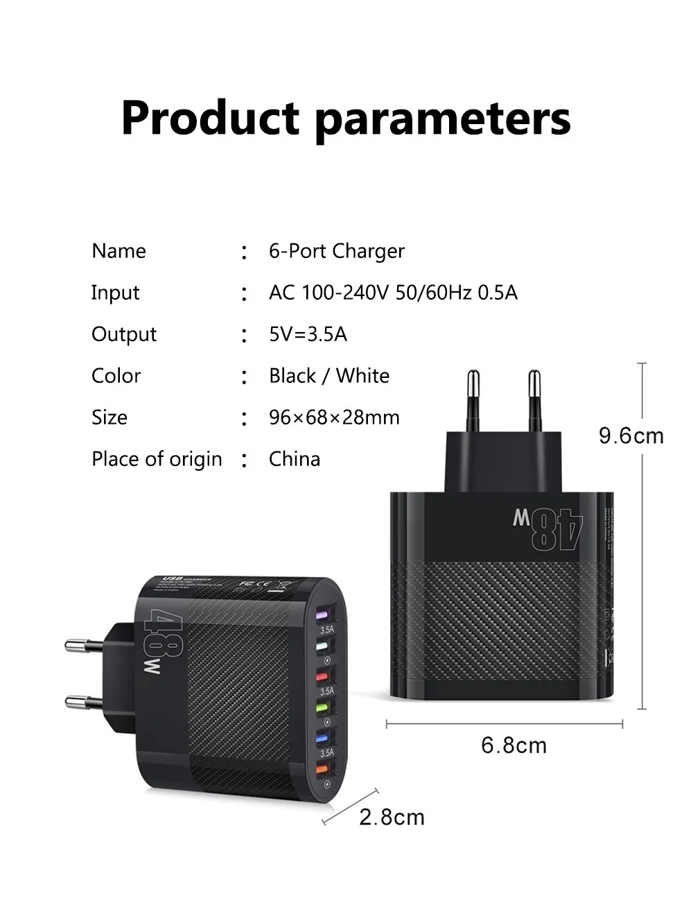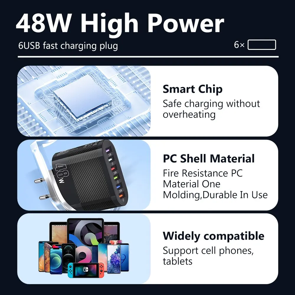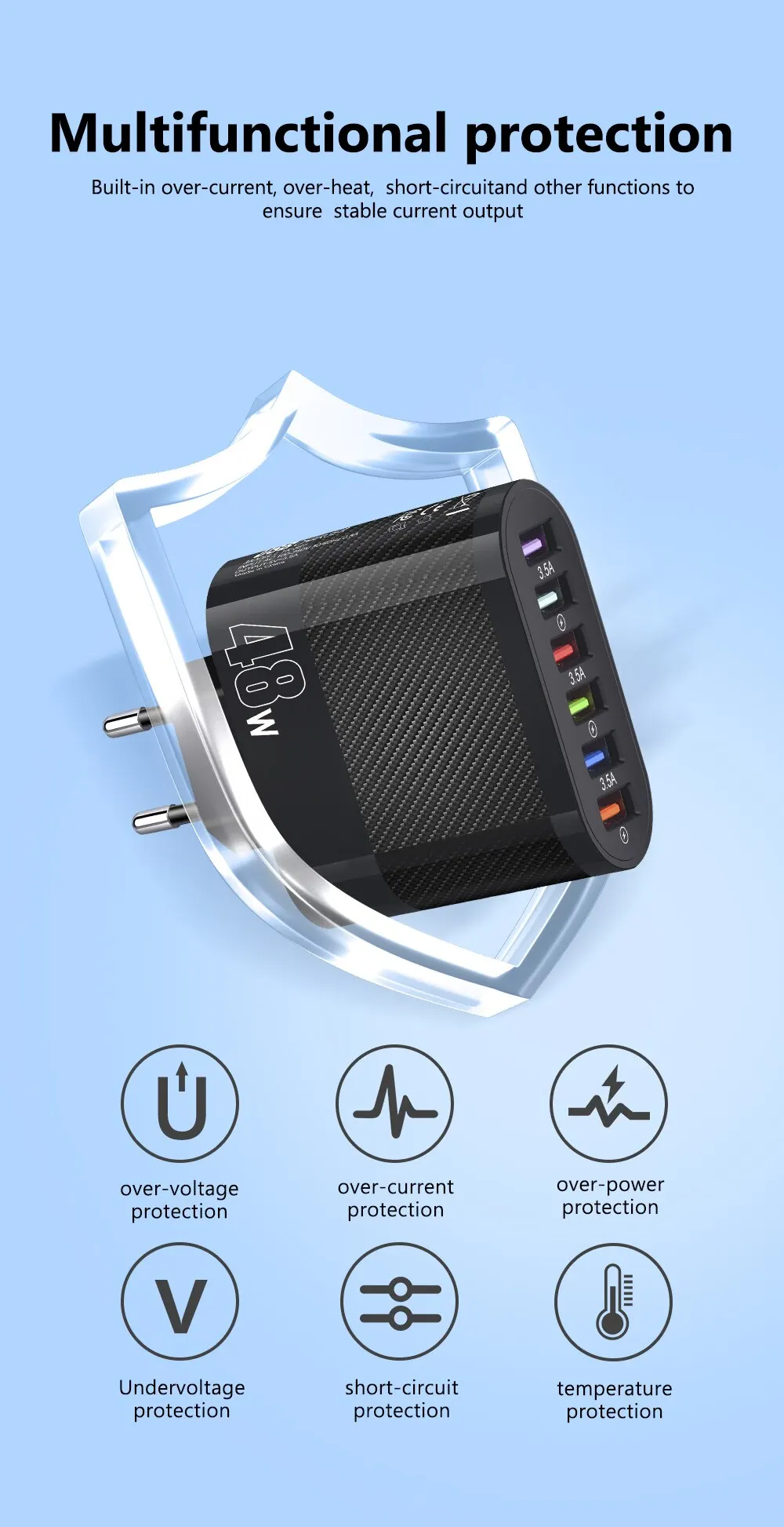 48W 6 In 1 USB Europe Plug QC 3.0 Mobile Phone Super Fast Charger EU US Plug Adapter 6 Port For iPhone Samsung Xiaomi Huawei