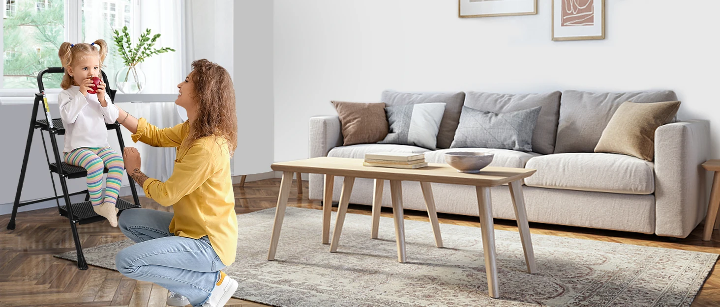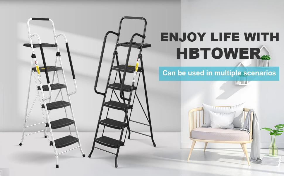 5 Step Ladder with Handrails, Folding Step Stool Portable Steel Ladder for Adults for Home Kitchen Library Office, White
