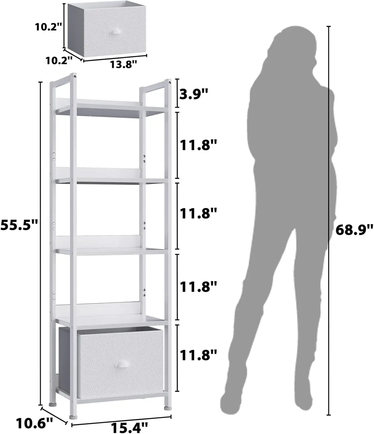 5 Tier Bookshelf with Drawer, Tall Narrow Bookcase with Shelves, Wood and Metal Bookshelves Storage Organizer