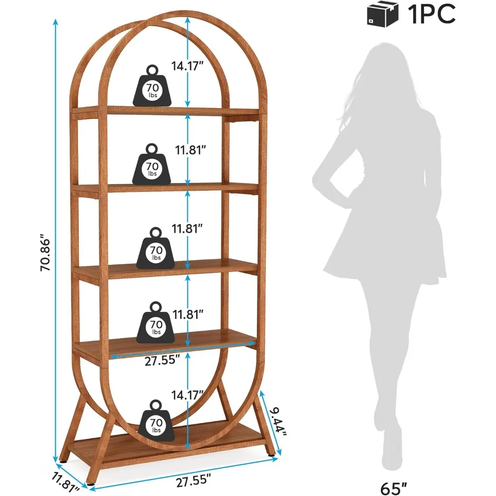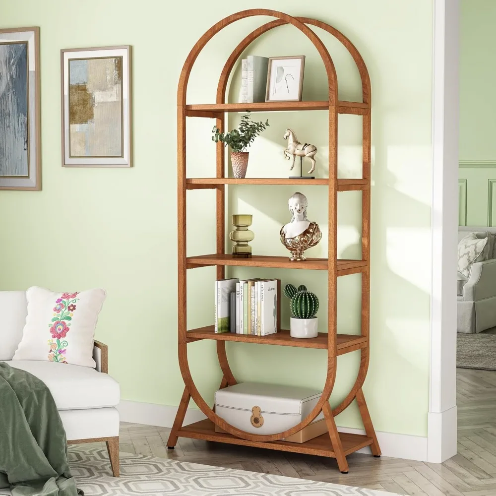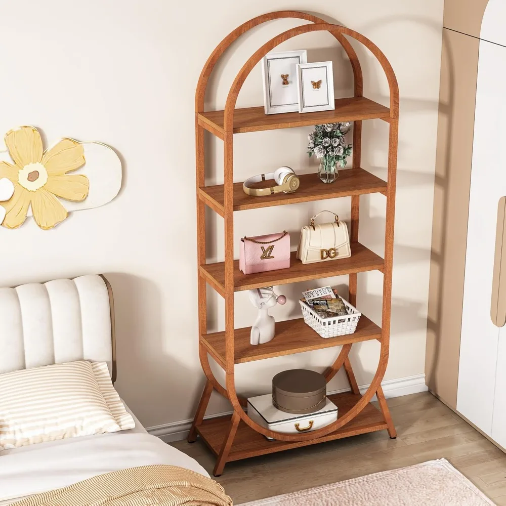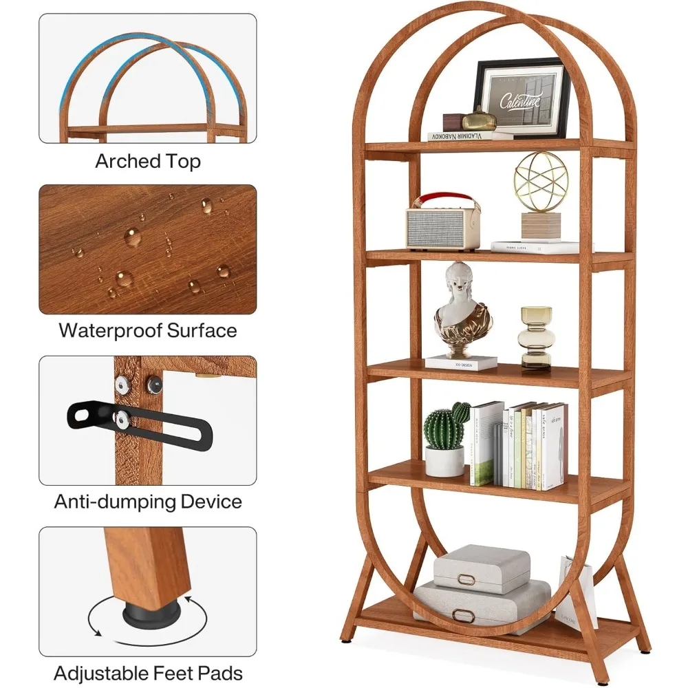 - 5-Shelf Arched Bookcase: This 5-tier wooden bookshelf offers generous storage and display space for your books, plants, decorations, photo frames, DVDs, toys, and more with ease. Get this bright brown bookcase for a stylish and functional storage solution