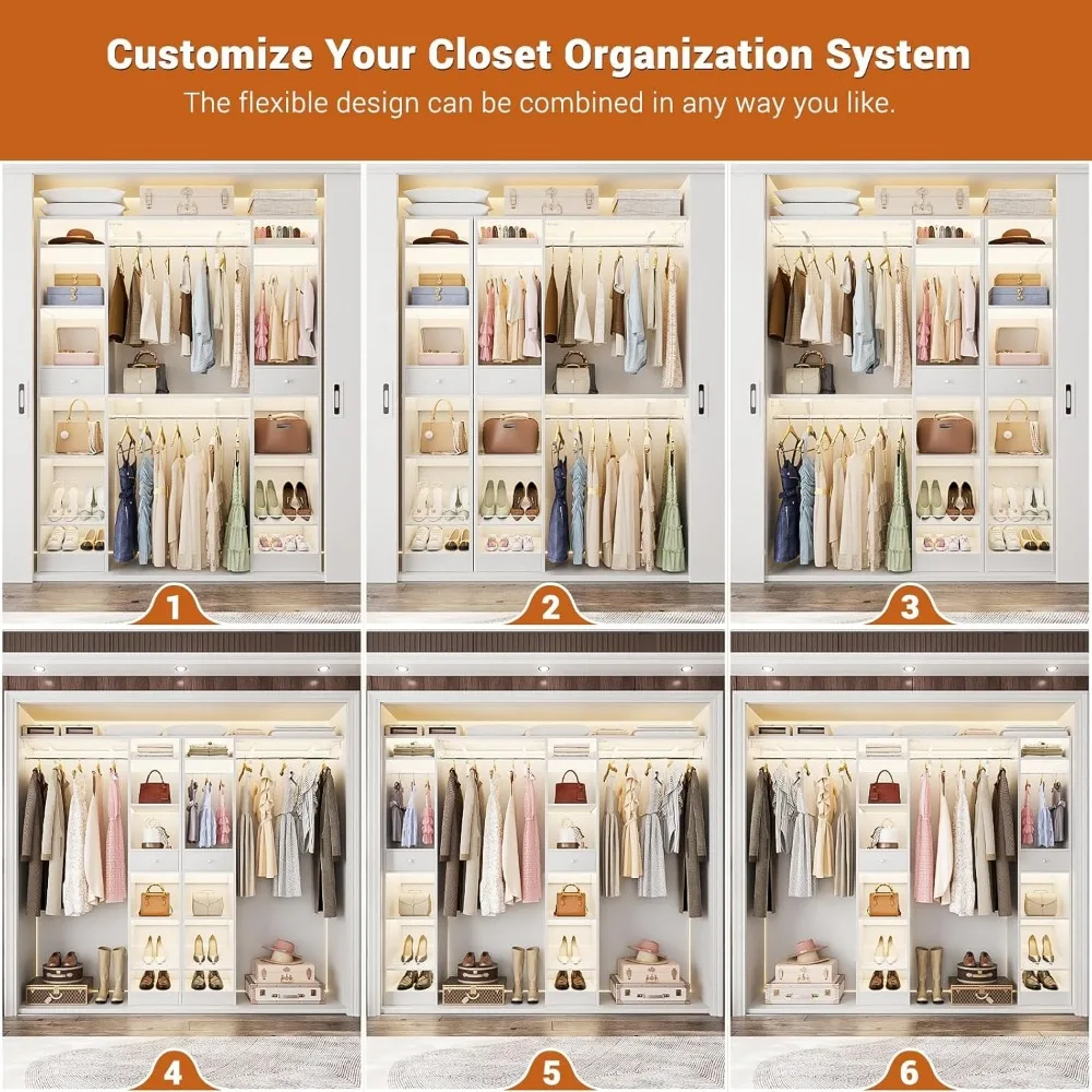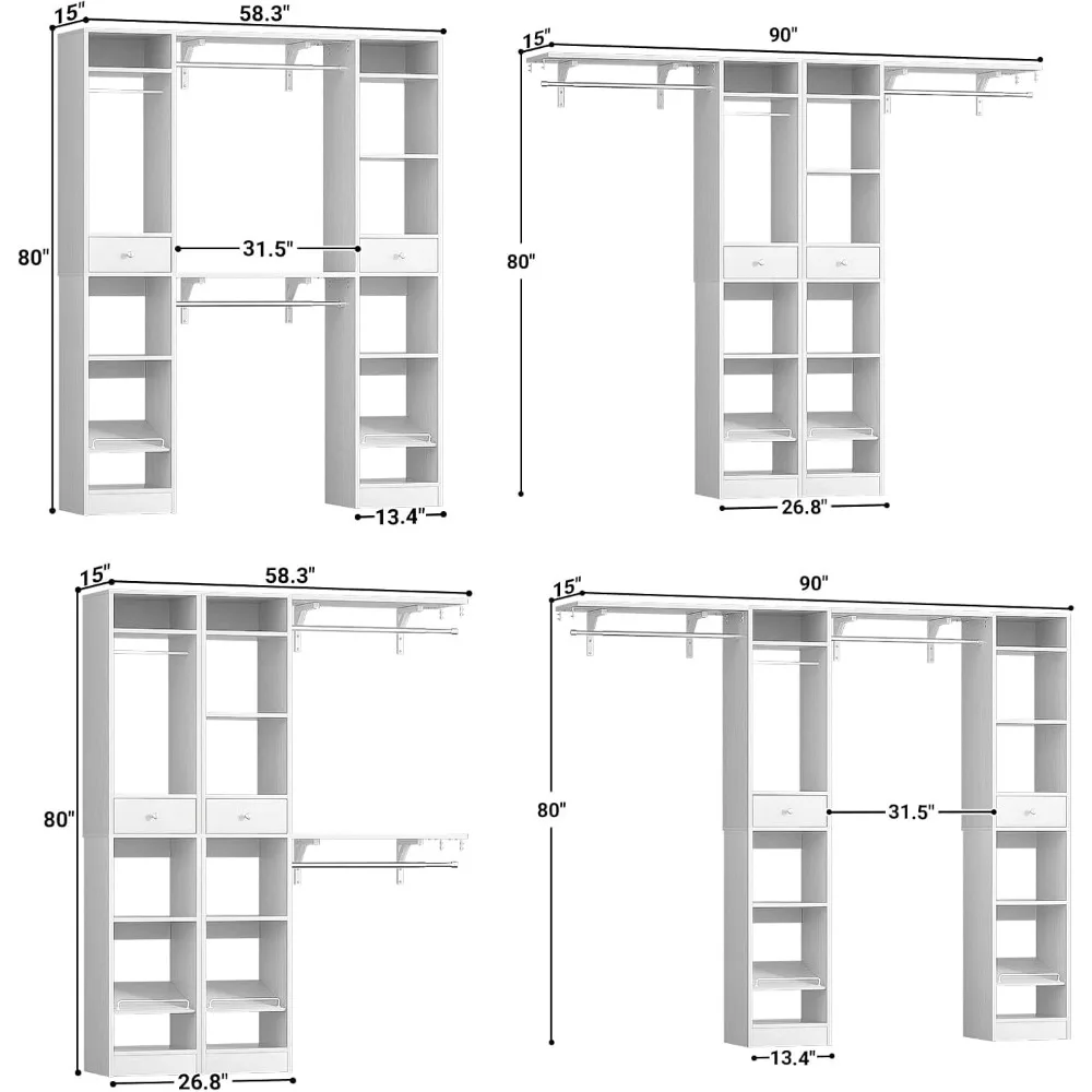 - 【 Flexible and Reversible Closet System】The 2 hanging bars are adjustable for both sides, and the two towers are separate, so the closet organizer system can be adjusted in 6 different configurations. The flexibility allows you to make it as big or small for different size spaces. It can fit 60″ W – 90″ W walk in closet system. You also can D.I.Y. your closet by cutting the boards and metal hanging bars to fit whatever customization you need.