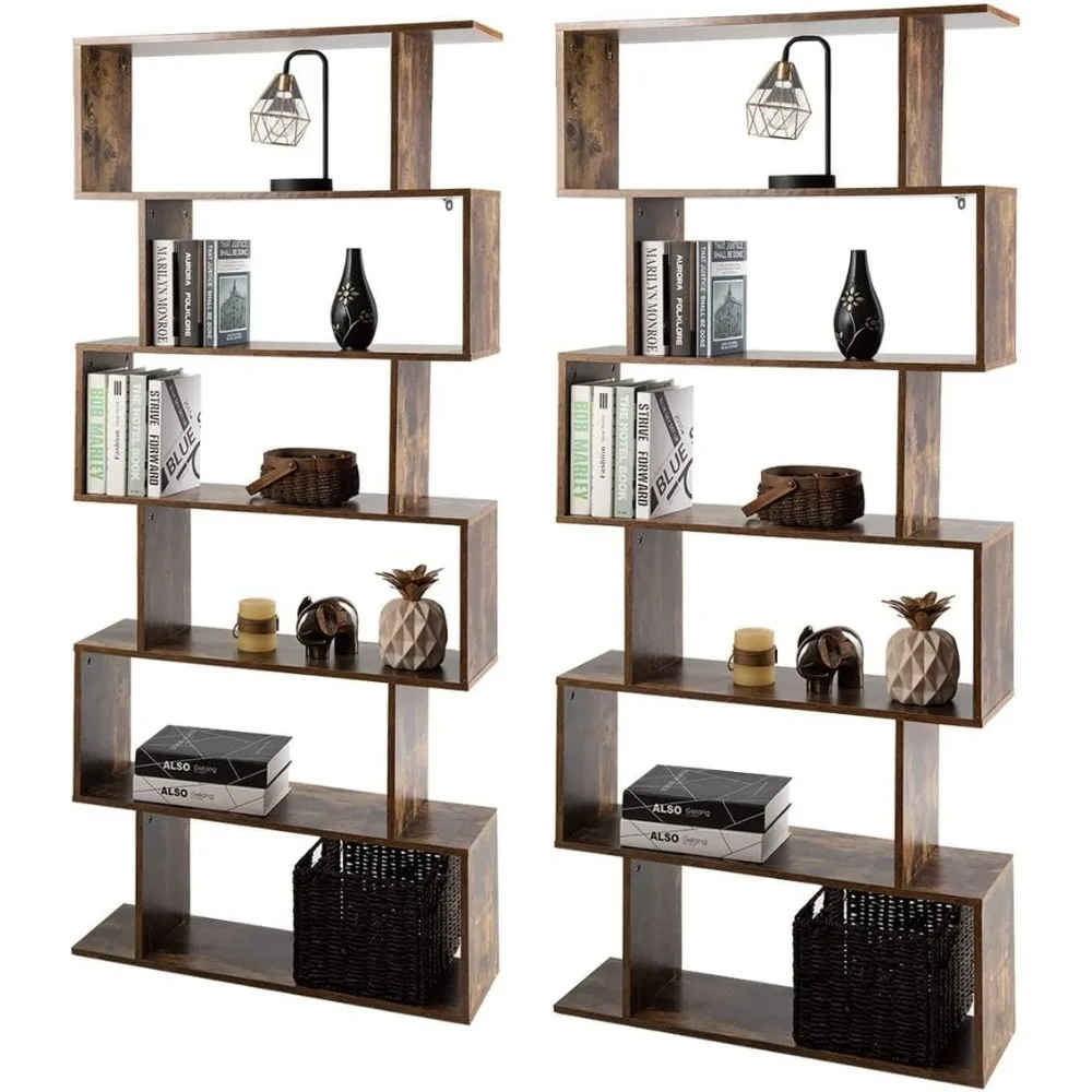 6-Tier Geometric Bookcase, Modern S-Shaped Storage Display Bookshelf for Living Room, Anti-Toppling Device, Home Office Wooden