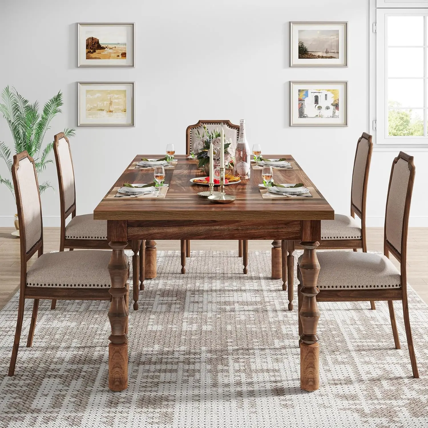 - Dining Table: Adorned in a rich walnut wood hue, the entire surface exudes an air of sophistication and generosity. The intricately designed carved turned legs lend the table an exquisite finishing touch. With its chic rectangular design, this dining table effortlessly complements any interior style, providing an impeccable pairing with your carefully curated dining chairs