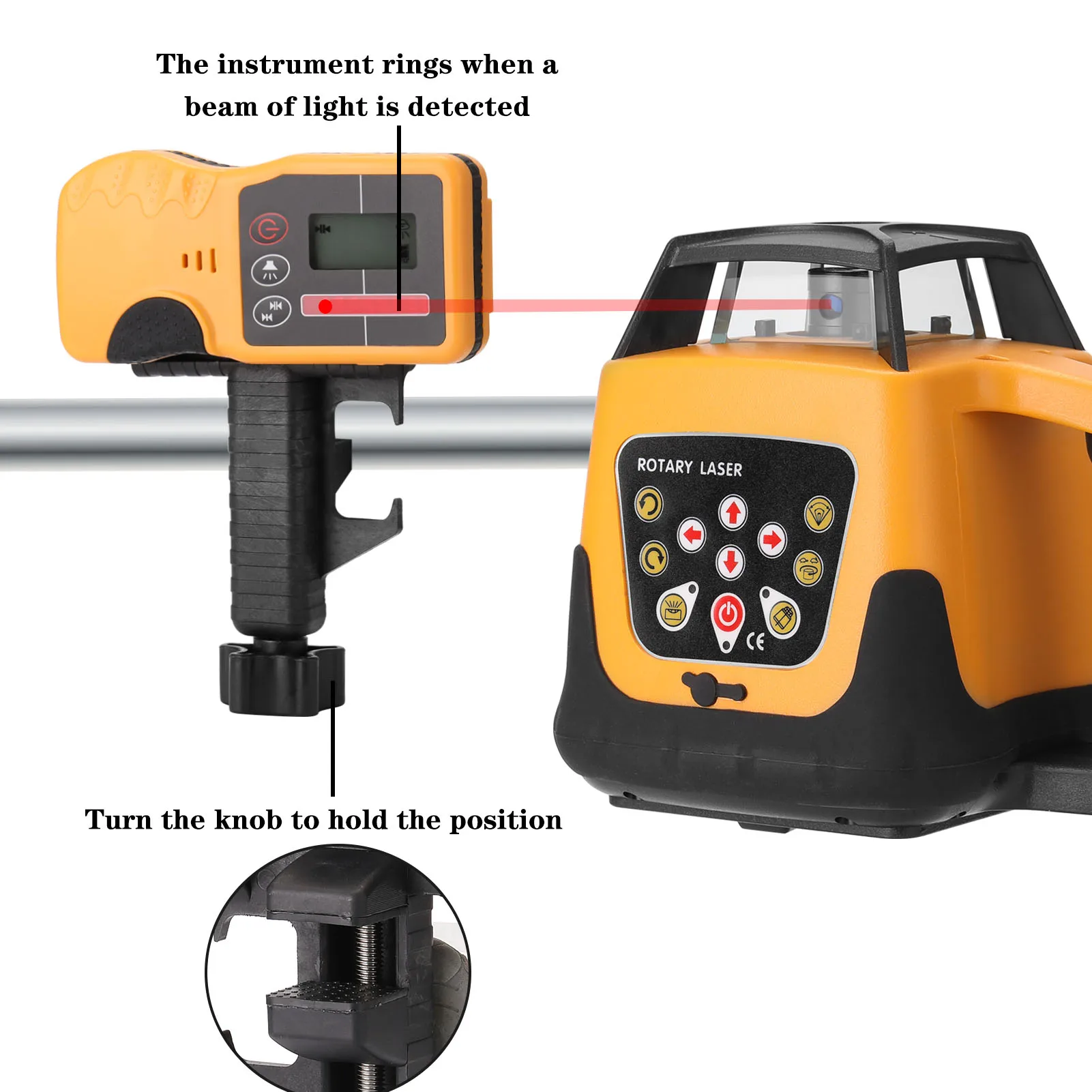 When the instrument is set upright, it will emit laser-beam to form a horizontal scanning surface and a plumb line automatically.