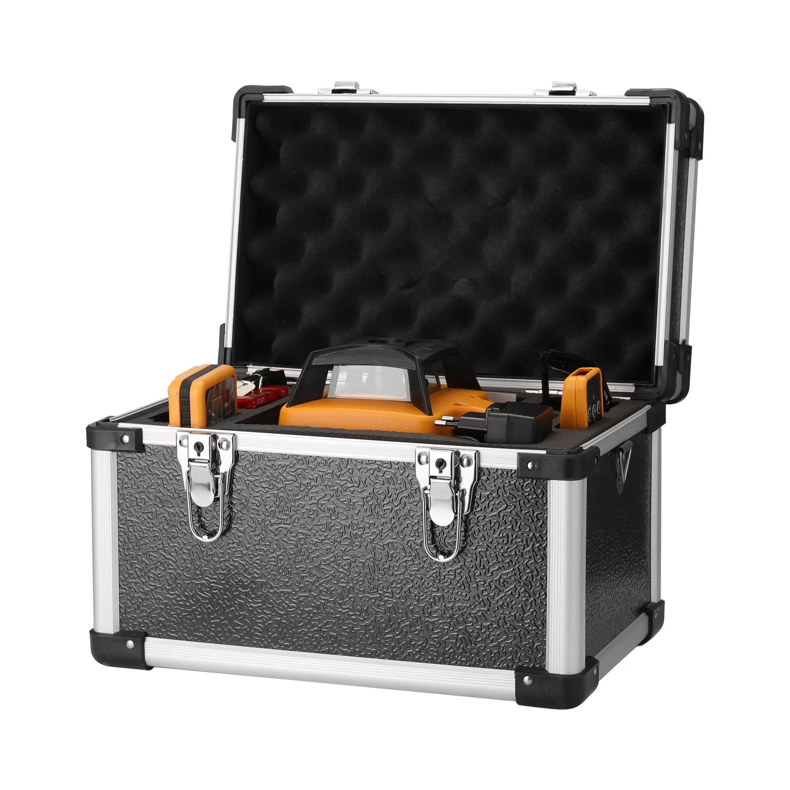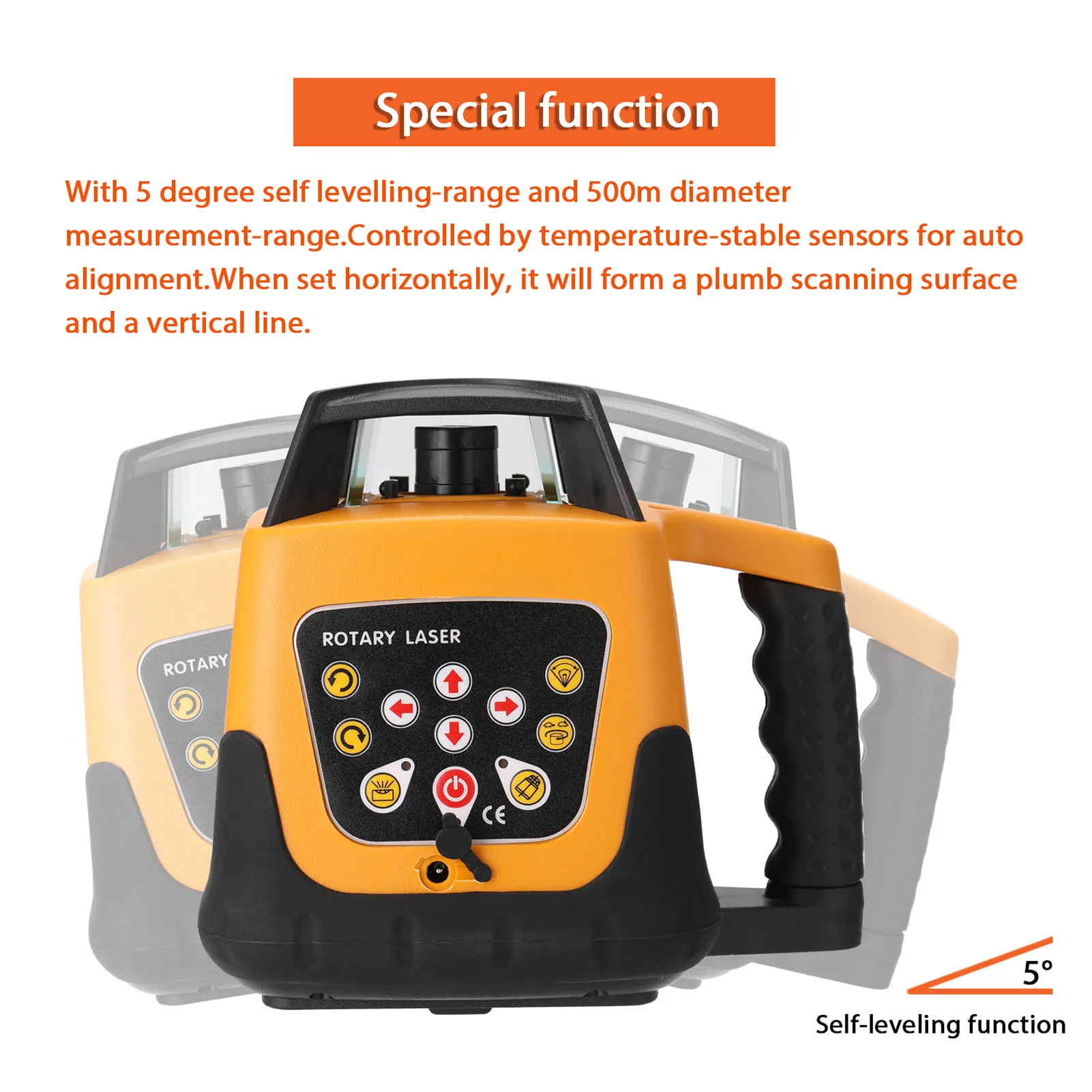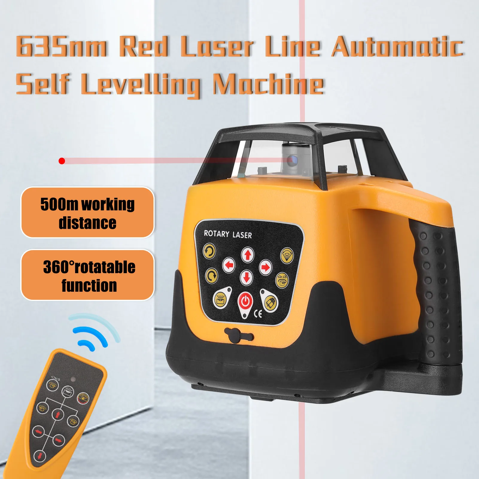 This laser leveling machine will cast a 635nm red visible laser beam to level positioning of the laser beam height. It has a 500m working distance and 360°rotatable function with the clear, bright and stable lines. With 5 degree self levelling-range and 500m diameter measurement-range. Two working modes design, spinning direction adjustable, speed adjustable, angle adjustable, and all functions can be used with remote controller.