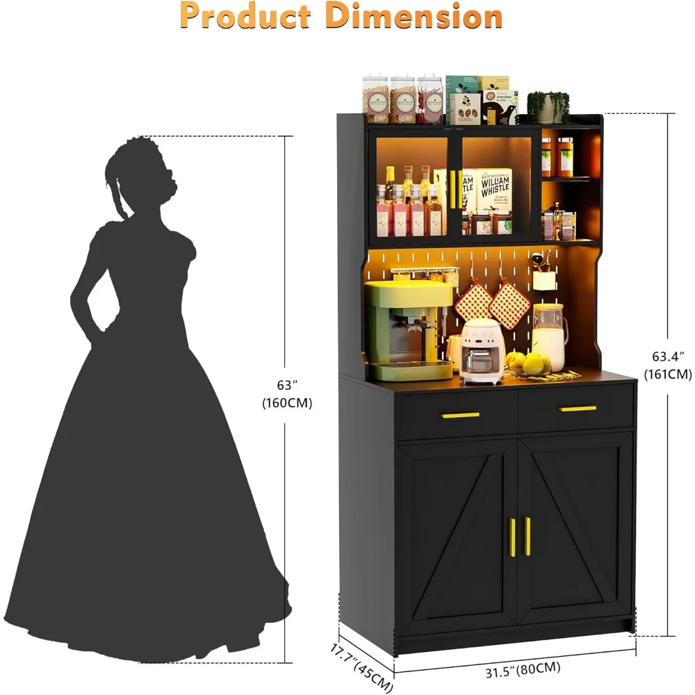 64″ Farmhouse Kitchen Pantry with Auto Sensor LED,Storage Cabinets with 2 Outlets for Microwave & USB-C Ports, Kitchen Cabinets