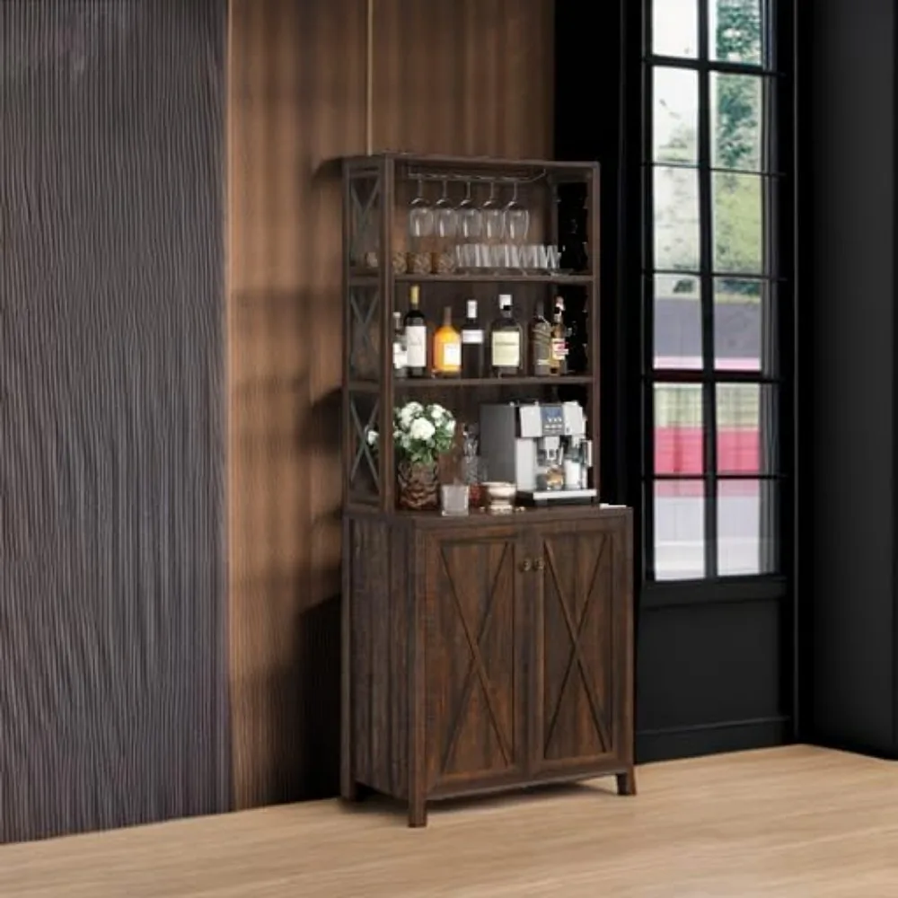 67″ Tall Wine Bar Cabinet for Liquor and Glasses, Farmhouse Kitchen Cabinet Coffee Bar with Adjustable Shelves, Open Storage