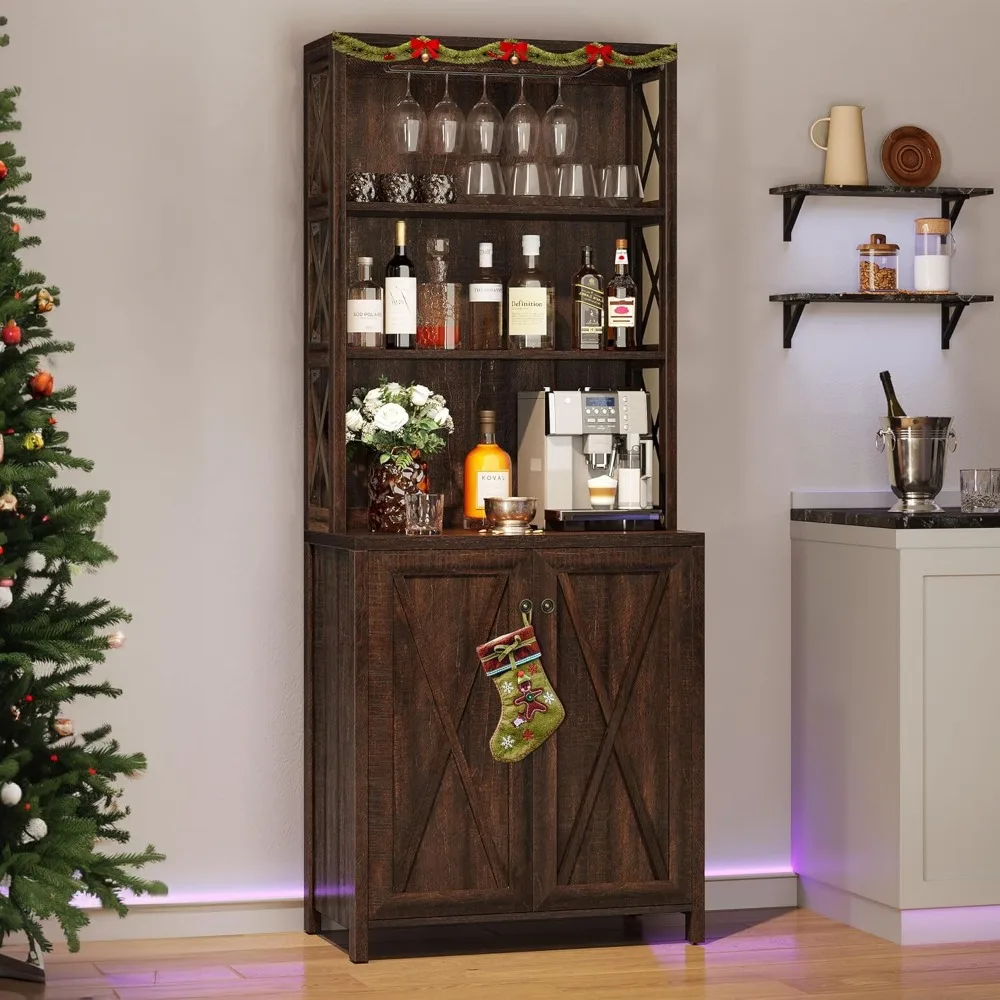 - Multi-Purpose: Tall Bar Cabinet features an exquisite combination of open storage shelves and hidden three shelf cabinets, open storage shelves for your wine glasses and wine, not only can be used as a home bar, microwave oven rack, buffet, sideboard, coffee table, etc., but also can meet your various storage needs in the kitchen, pantry, dining room, living room or bar.