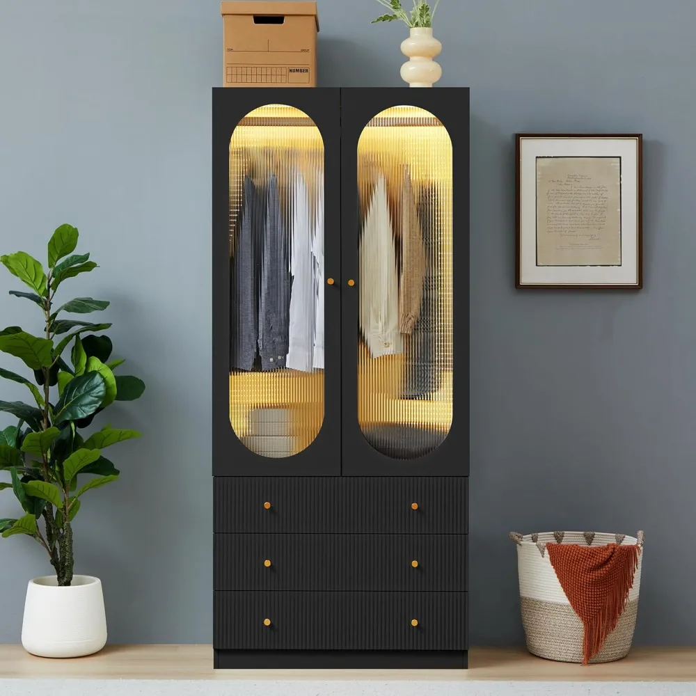 - 【 Product Features 】 This wardrobe cabinet is equipped with 3 colors of LED lights and glass doors, so even in pitch black, you can easily find the clothes and items you want. It is also equipped with 3 fluted drawers, which are not only stylish and beautiful, but also convenient for organizing clothes, socks, toys or other items in the room