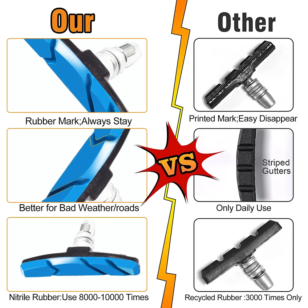 1. Made of high quality nitrile rubber: wear-resistant, does not hurt the rim, and can effectively reduce the braking sound, let you say goodbye to harsh noise, every braking is so comfortable. Note: Brake is a matter of life safety, do not use inferior brake pads.
