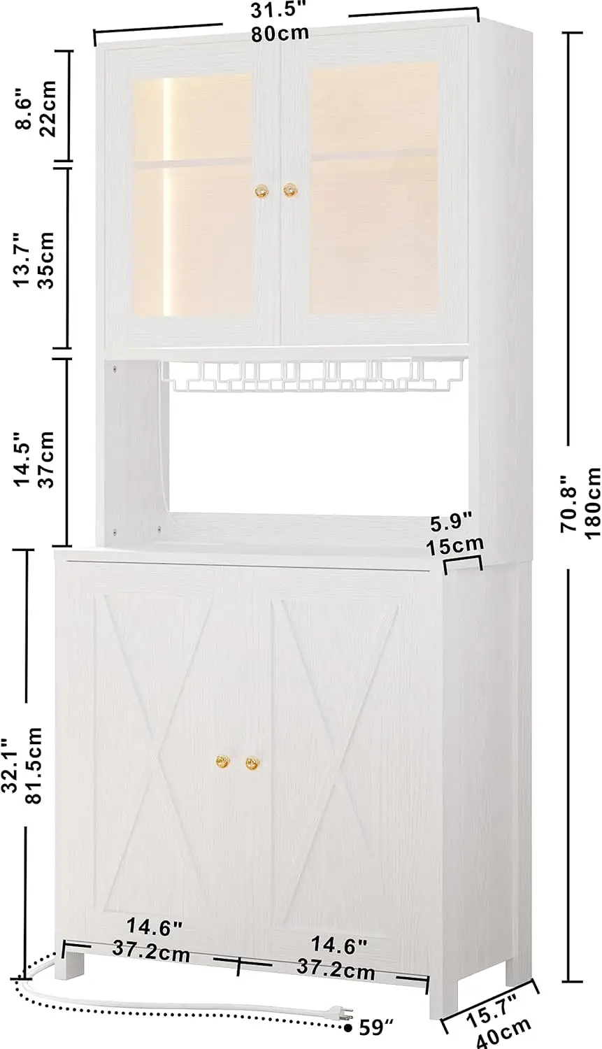 71” Coffee Bar Cabinets with LED Light, Power Strip and Glass Holder, Tall Freestanding Liquor Cabinet Bar, Dining Room, White