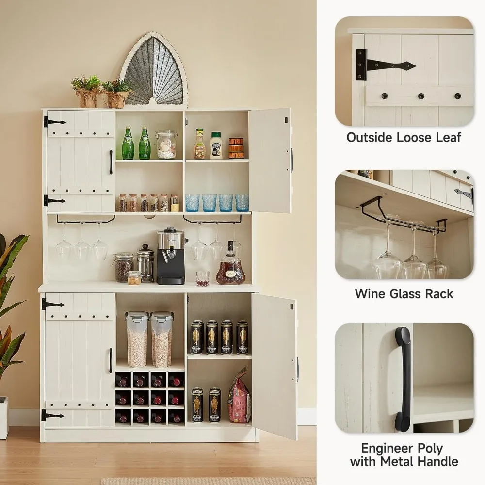 • Ample Storage Space: wine cabinet consists of a buffet and upper hutch, offering spacious storage. The bottom buffet contains 1 open wine storage compartment and 2 closed storage spaces, allowing for organized kitchenware, jars, snacks, and liquor storage.