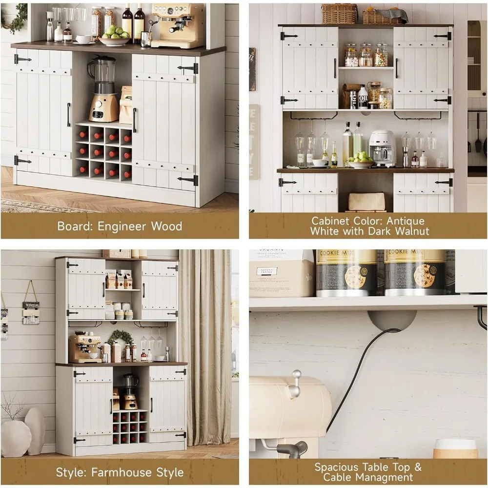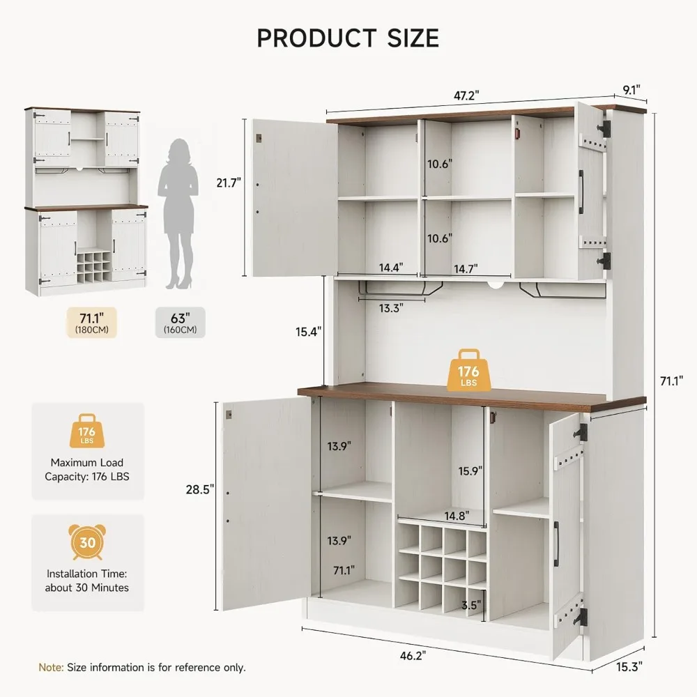 - Ample Storage Space: wine cabinet consists of a buffet and upper hutch, offering spacious storage. The bottom buffet contains 1 open wine storage compartment and 2 closed storage spaces, allowing for organized kitchenware, jars, snacks, and liquor storage.