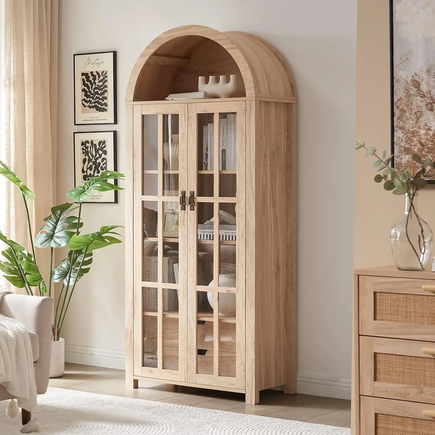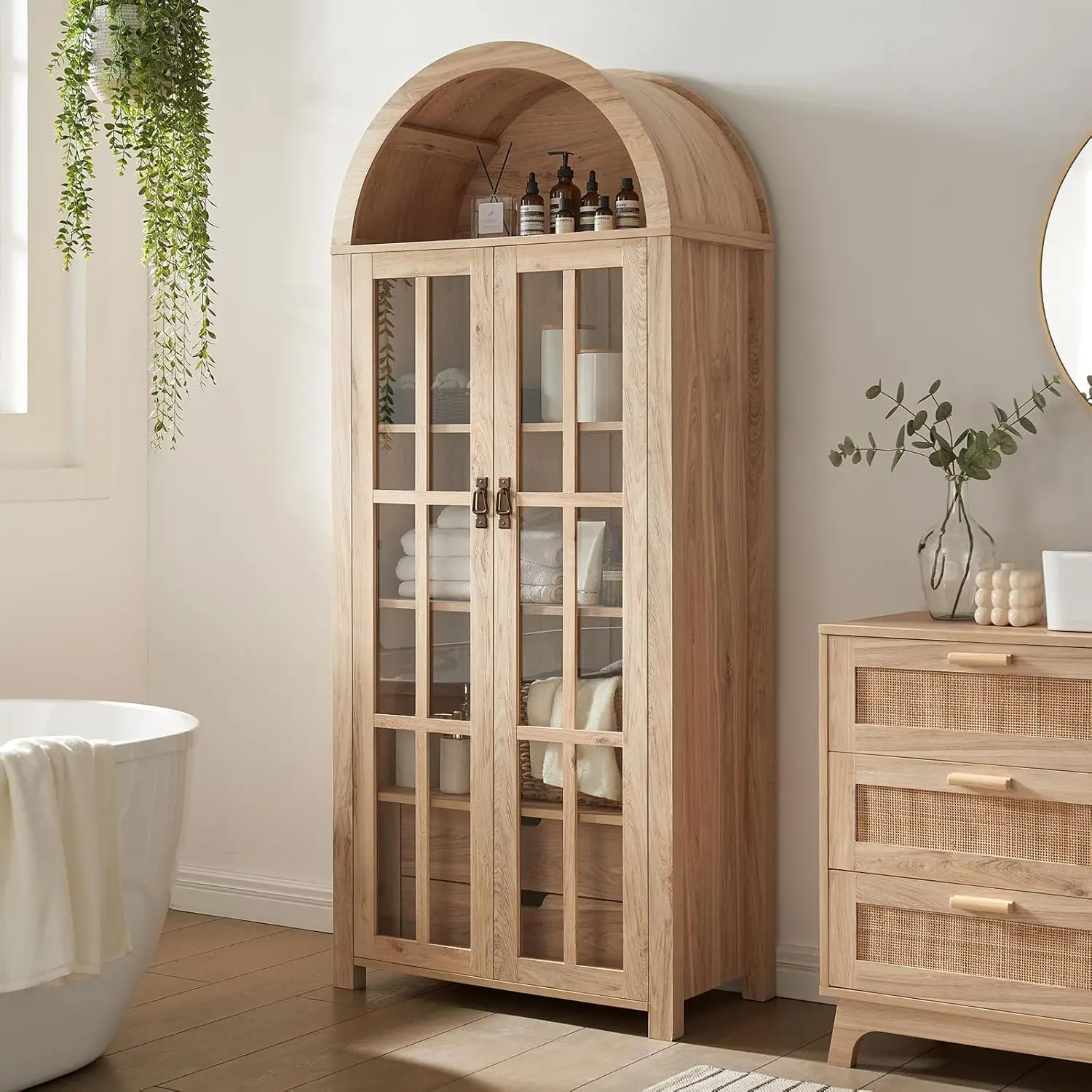 71″ Tall Arched Kitchen Pantry Storage Cabinet with Glass Doors, 5 Tier Modern Bookshelf with 2 Drawers, Wooden Storage Cabinet with Doors and Shelves for Living & Dining Room, Bathroom, Laundry Room