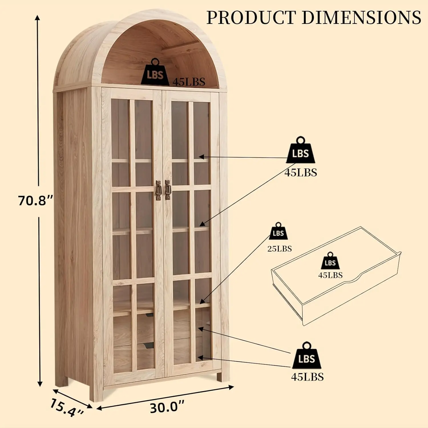 - Chic Arched Design:This kitchen pantry cabinet measures 71″ H x 30″ L x 15.4″ W, Drawr Dimensions:3.9″ H x 20″ L x 9.4″D.The arched open shelf features a distinctive curved design that adds a touch of elegance to any space. Its open layout allows for easy display and access to items, making it perfect for showcasing books, plants, or decorative pieces.
